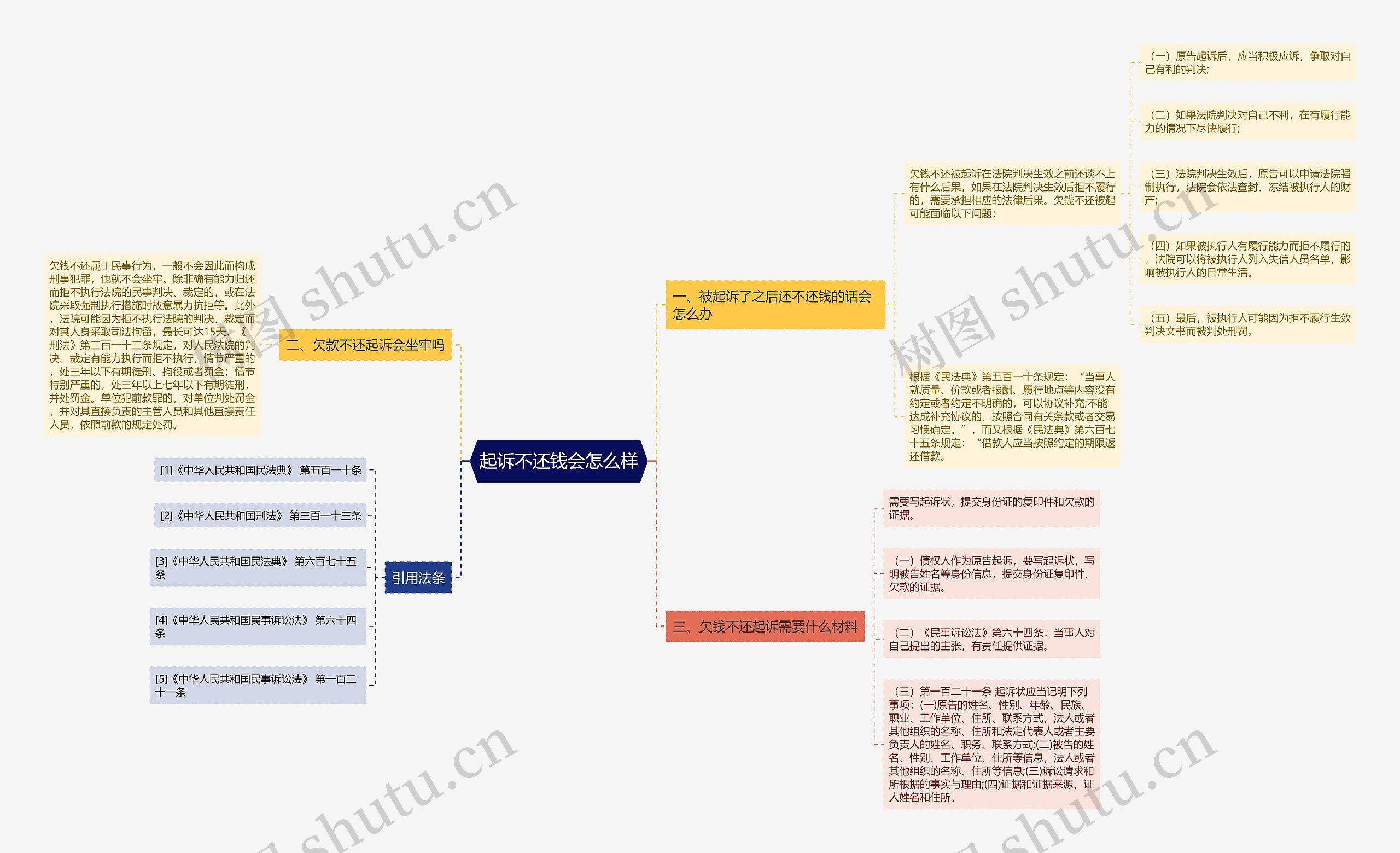 树图思维导图提供《起诉不还钱会怎么样》在线思维导图免费制作,点击“编辑”按钮,可对《起诉不还钱会怎么样》进行在线思维导图编辑,本思维导图属于思维导图模板主题,文件编号是:111d364fc0f3a64e8eda757c7deb8d48