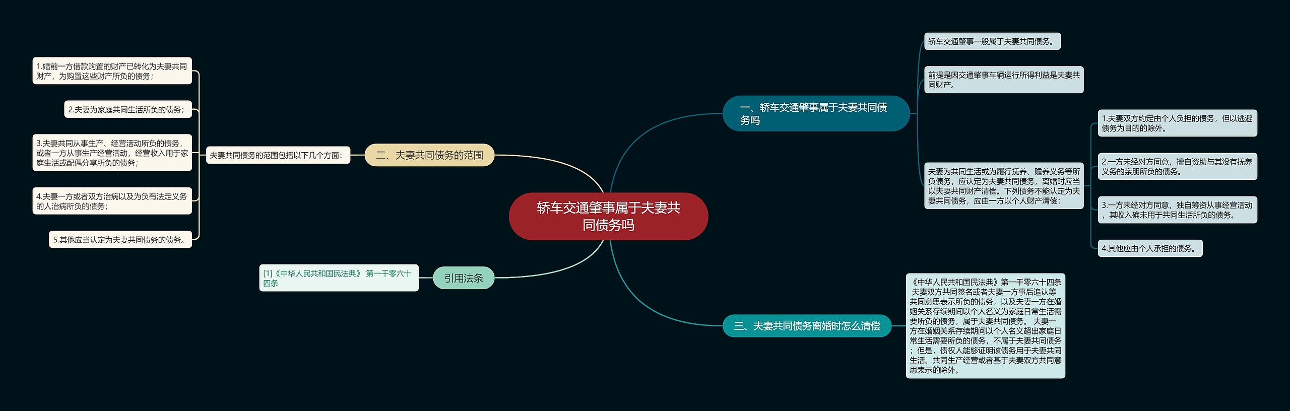 树图思维导图提供《轿车交通肇事属于夫妻共同债务吗》在线思维导图免费制作,点击“编辑”按钮,可对《轿车交通肇事属于夫妻共同债务吗》进行在线思维导图编辑,本思维导图属于思维导图模板主题,文件编号是:4a16f6cd8dbc84d47c97a04c6077220e