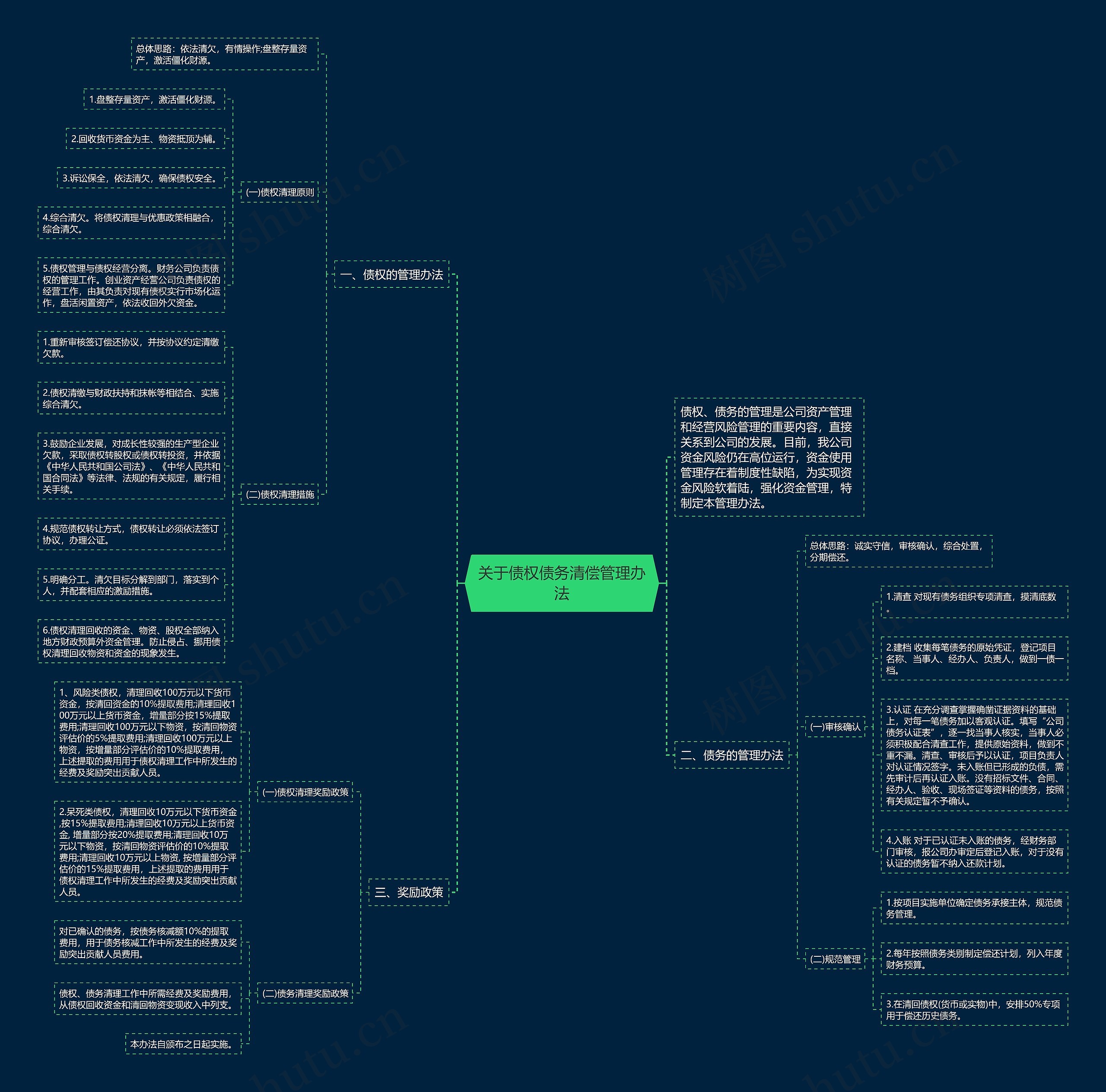 树图思维导图提供《关于债权债务清偿管理办法》在线思维导图免费制作,点击“编辑”按钮,可对《关于债权债务清偿管理办法》进行在线思维导图编辑,本思维导图属于思维导图模板主题,文件编号是:a5f93de17a261764d22564fddcaee583