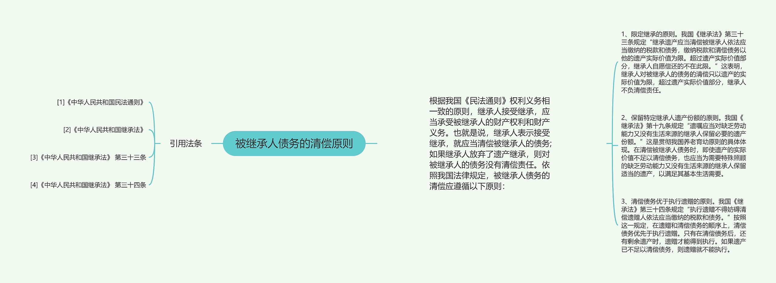 1、限定继承的原则。我国《继承法》第三十三条规定“继承遗产应当清偿被继承人依法应当缴纳的税款和债务,缴纳税款和清偿债务以他的遗产实际价值为限。超过遗产实际价值部分,继承人自愿偿还的不在此限。”这表明,继承人对被继承人的债务的清偿只以遗产的实际价值为限,超过遗产实际价值部分,继承人不负清偿责任。