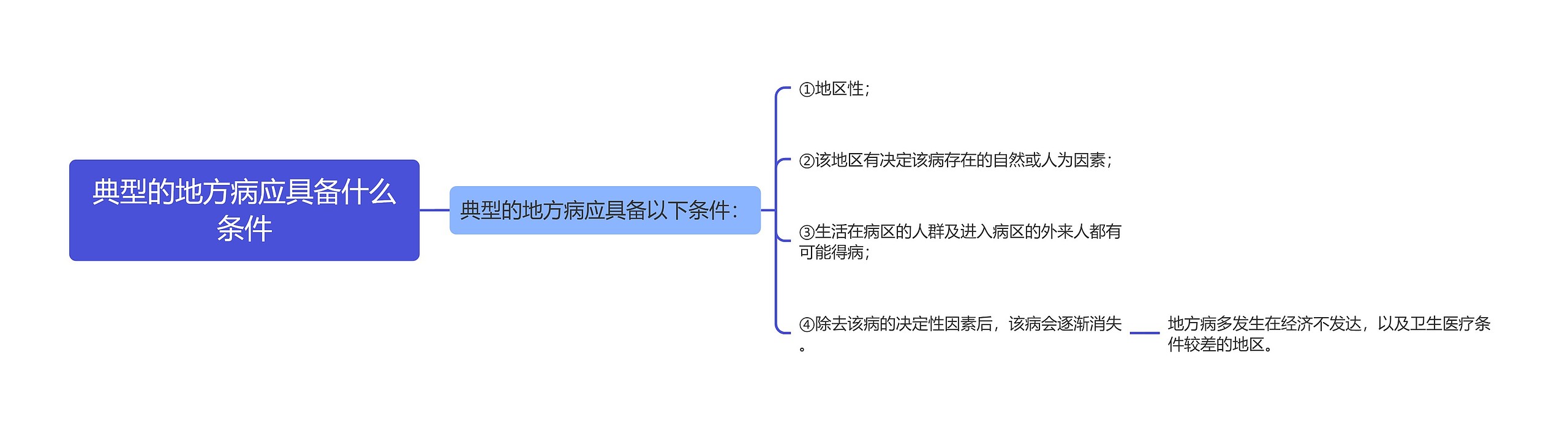 关于“典型的地方病应具备什么条件”,树图思维导图小编将整理的有关资料分享给大家,希望对想要了解的人提供参考。 典型的地方病应具备以下条件: ①地区性; ②该地区有决定该病存在的自然或人为因素; ③生活在病区的人群及进入病区的外来人都有可能得病; ④除去该病的决定性因素后,该病会逐渐消失。