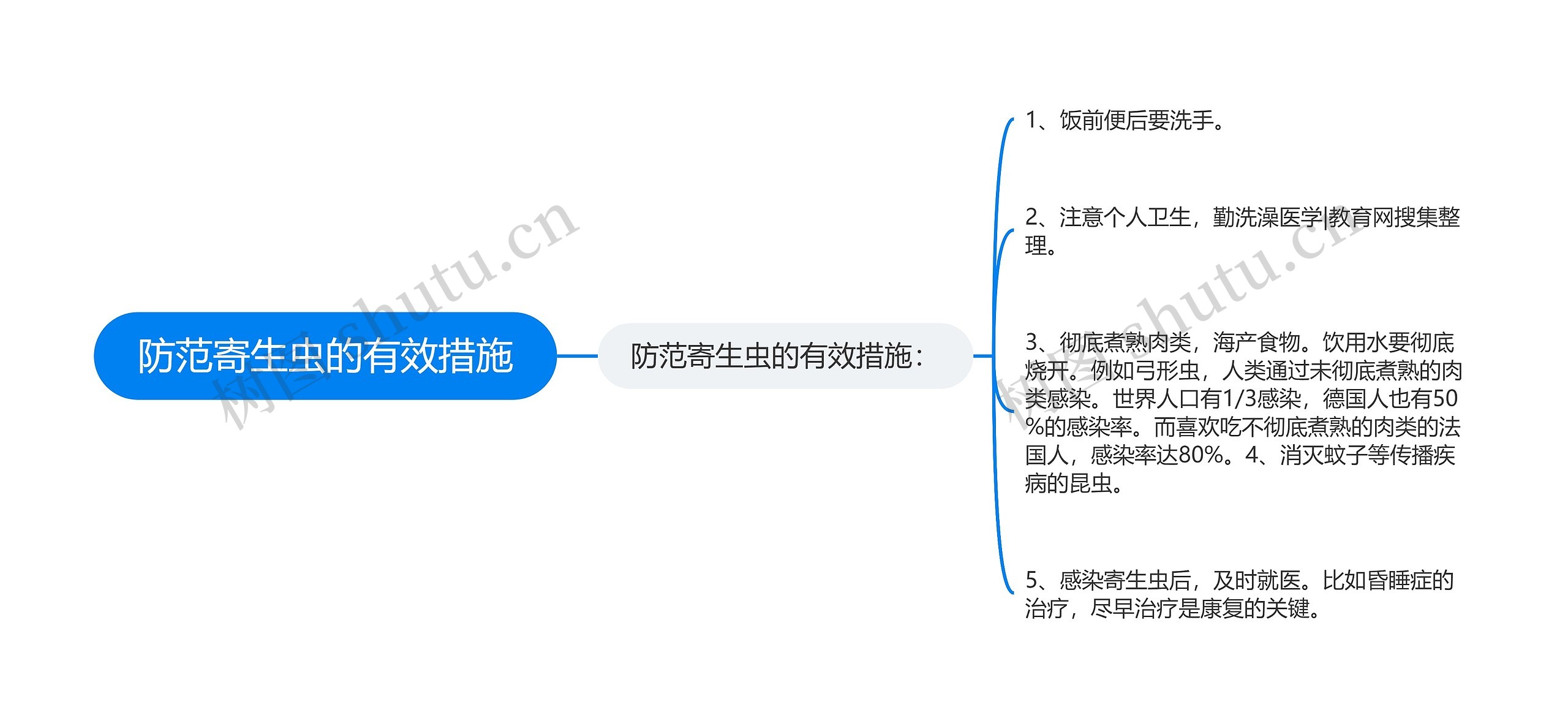 防范寄生虫的有效措施: 1、饭前便后要洗手。 2、注意个人卫生,勤洗澡医学|教育网搜集整理。 3、彻底煮熟肉类,海产食物。饮用水要彻底烧开。例如弓形虫,人类通过未彻底煮熟的肉类感染。世界人口有1/3感染,德国人也有50%的感染率。而喜欢吃不彻底煮熟的肉类的法国人,感染率达80%。 4、消灭蚊子等传播疾病的昆虫。