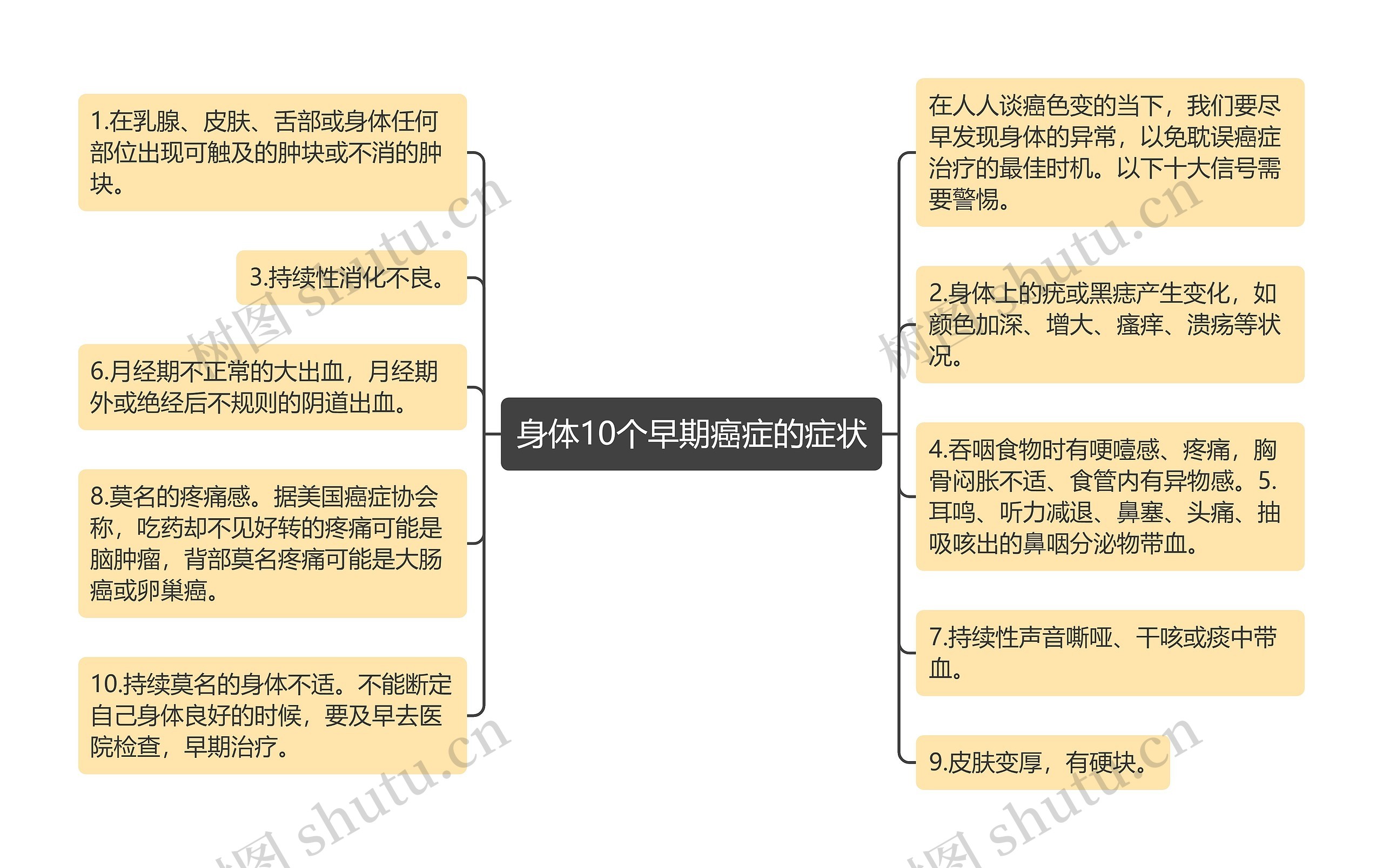 树图思维导图提供《身体10个早期癌症的症状》在线思维导图免费制作,点击“编辑”按钮,可对《身体10个早期癌症的症状》进行在线思维导图编辑,本思维导图属于思维导图模板主题,文件编号是:a8eced24fcaf946e731616f60cd41145