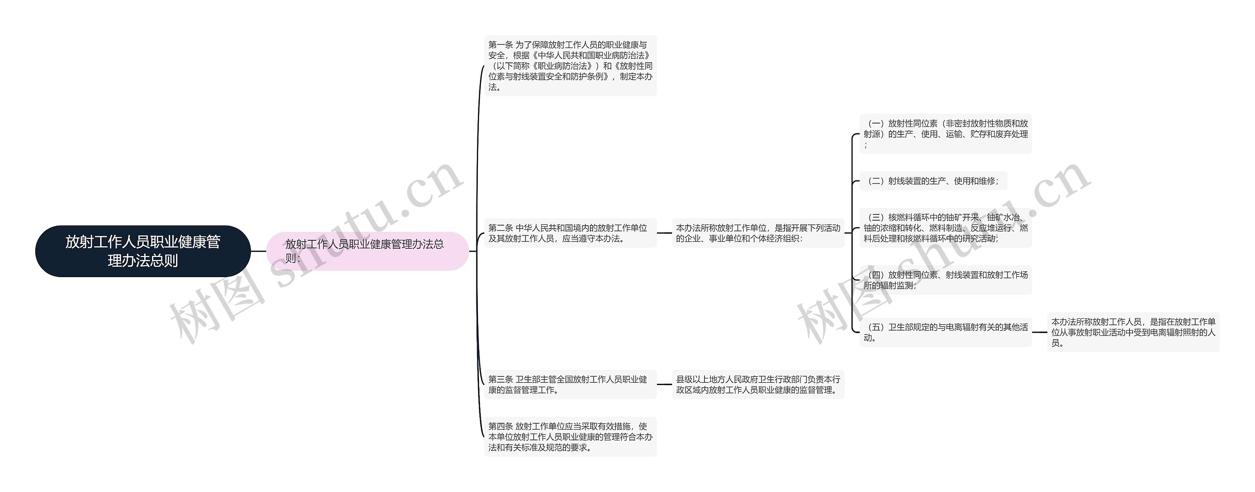 放射工作人员职业健康管理办法总则: 第一条 为了保障放射工作人员的职业健康与安全,根据《中华人民共和国职业病防治法》(以下简称《职业病防治法》)和《放射性同位素与射线装置安全和防护条例》,制定本办法。 第二条 中华人民共和国境内的放射工作单位及其放射工作人员,应当遵守本办法。