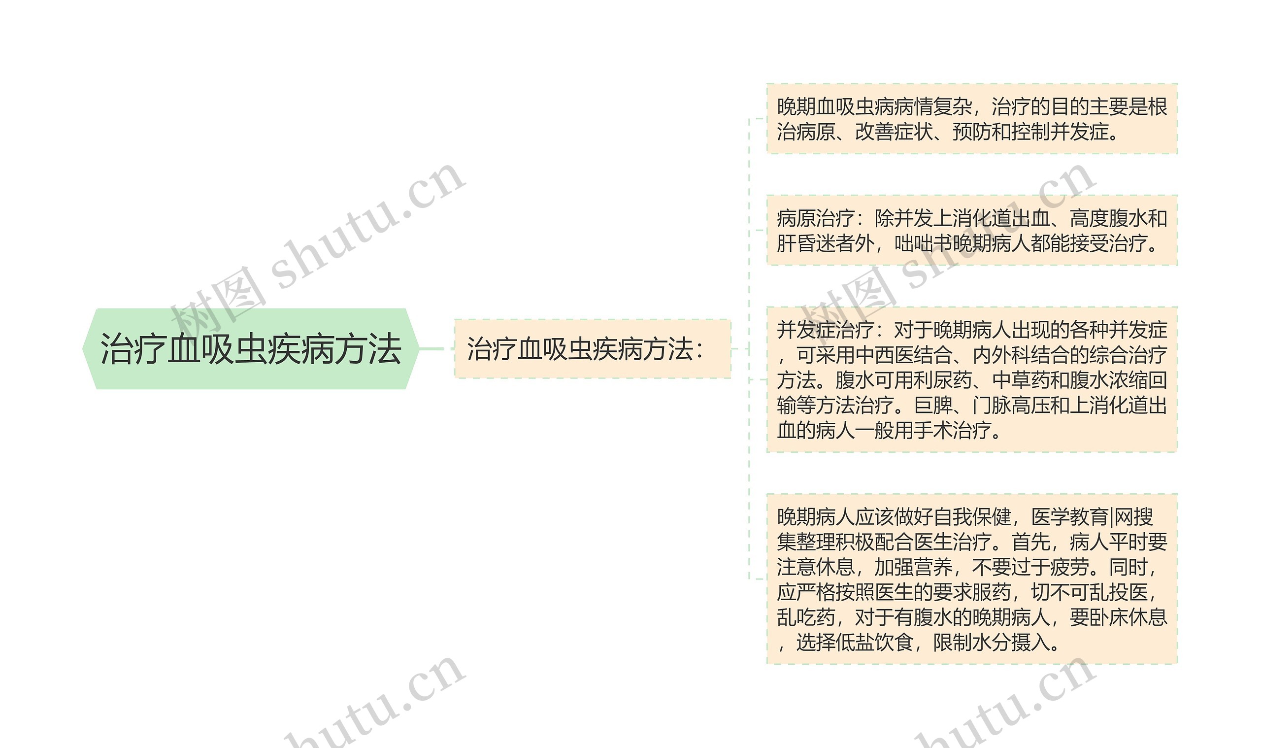 治疗血吸虫疾病方法: 晚期血吸虫病病情复杂,治疗的目的主要是根治病原、改善症状、预防和控制并发症。 病原治疗:除并发上消化道出血、高度腹水和肝昏迷者外,咄咄书晚期病人都能接受治疗。 并发症治疗:对于晚期病人出现的各种并发症,可采用中西医结合、内外科结合的综合治疗方法。