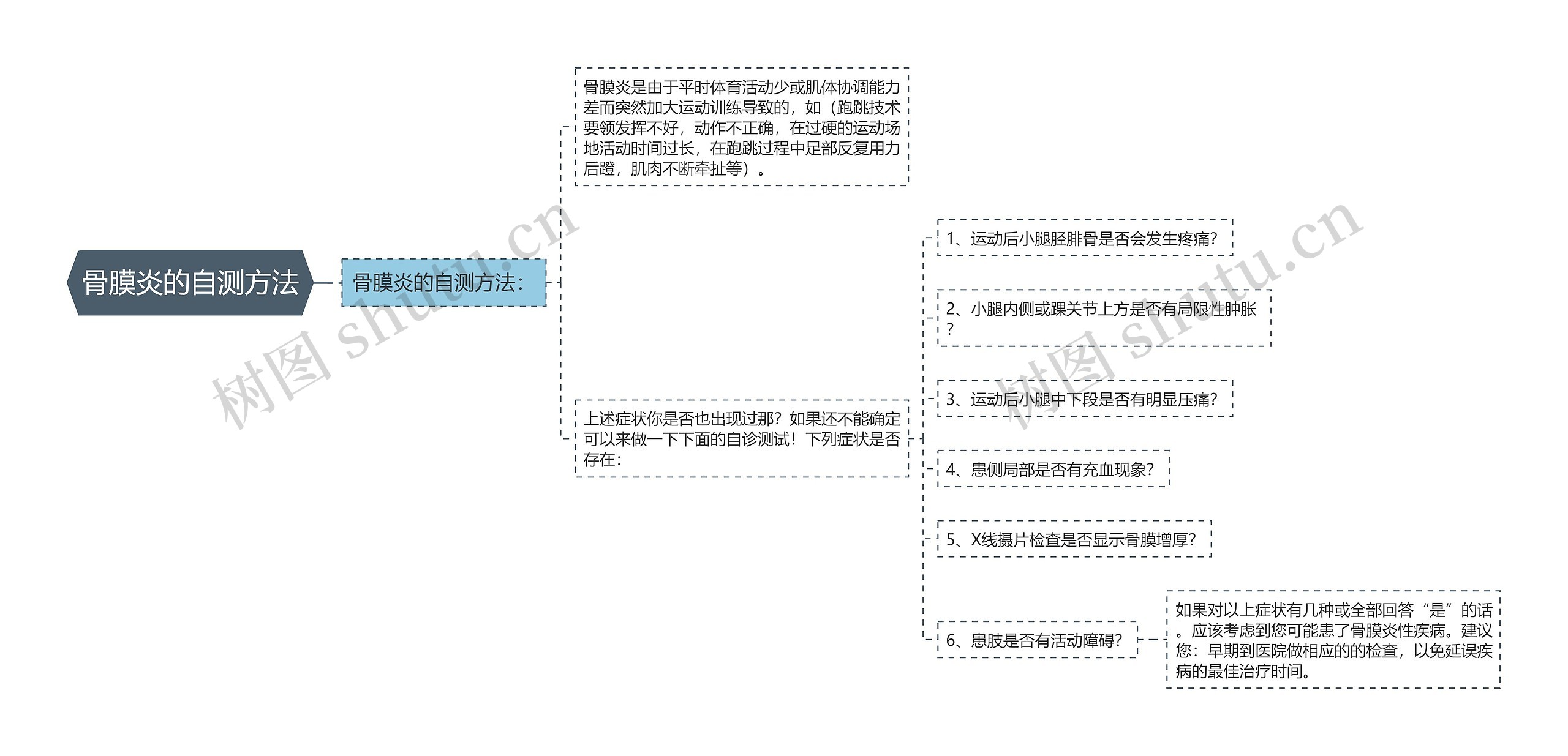 树图思维导图提供《骨膜炎的自测方法》在线思维导图免费制作,点击“编辑”按钮,可对《骨膜炎的自测方法》进行在线思维导图编辑,本思维导图属于思维导图模板主题,文件编号是:f27ad4d9ff7c75bff37eee113eb5d9fc