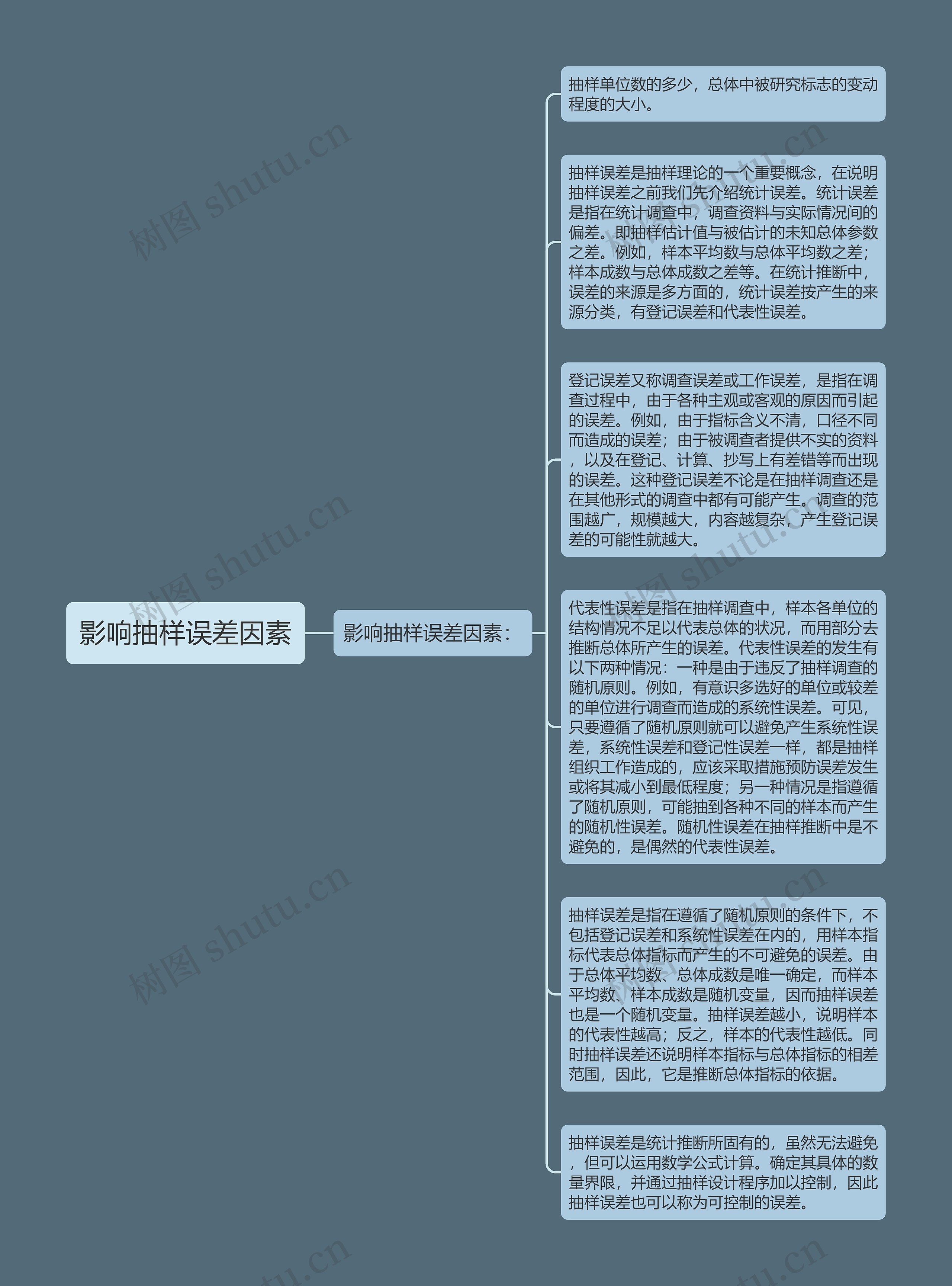 抽样误差是指在遵循了随机原则的条件下,不包括登记误差和系统性误差在内的,用样本指标代表总体指标而产生的不可避免的误差。由于总体平均数、总体成数是唯一确定,而样本平均数、样本成数是随机变量,因而抽样误差也是一个随机变量。抽样误差越小,说明样本的代表性越高;反之,样本的代表性越低。同时抽样误差还说明样本指标与总体指标的相差范围,因此,它是推断总体指标的依据。
