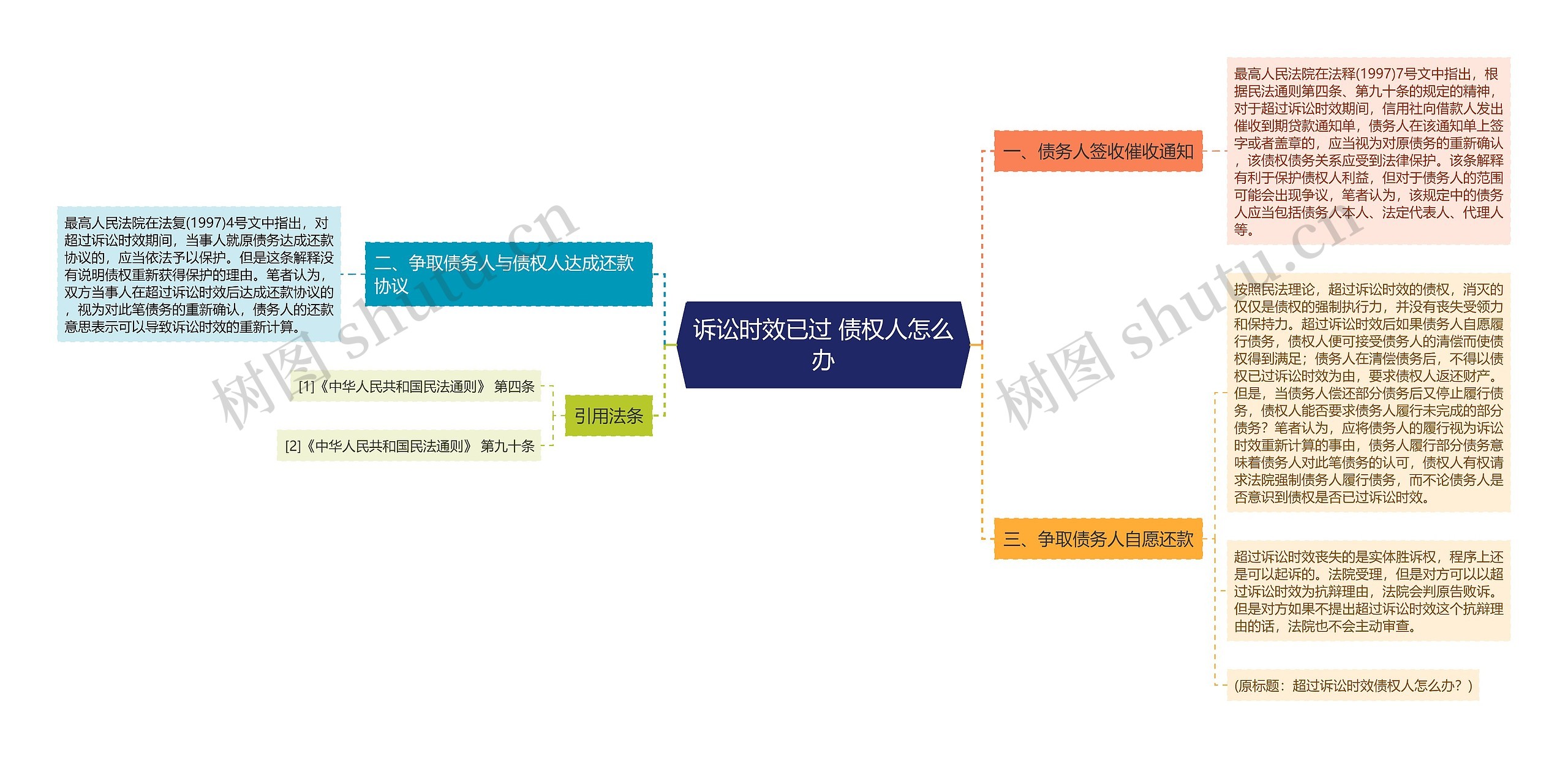 树图思维导图提供《诉讼时效已过 债权人怎么办》在线思维导图免费制作,点击“编辑”按钮,可对《诉讼时效已过 债权人怎么办》进行在线思维导图编辑,本思维导图属于思维导图模板主题,文件编号是:6213a89af5c7198985876f413ee37942