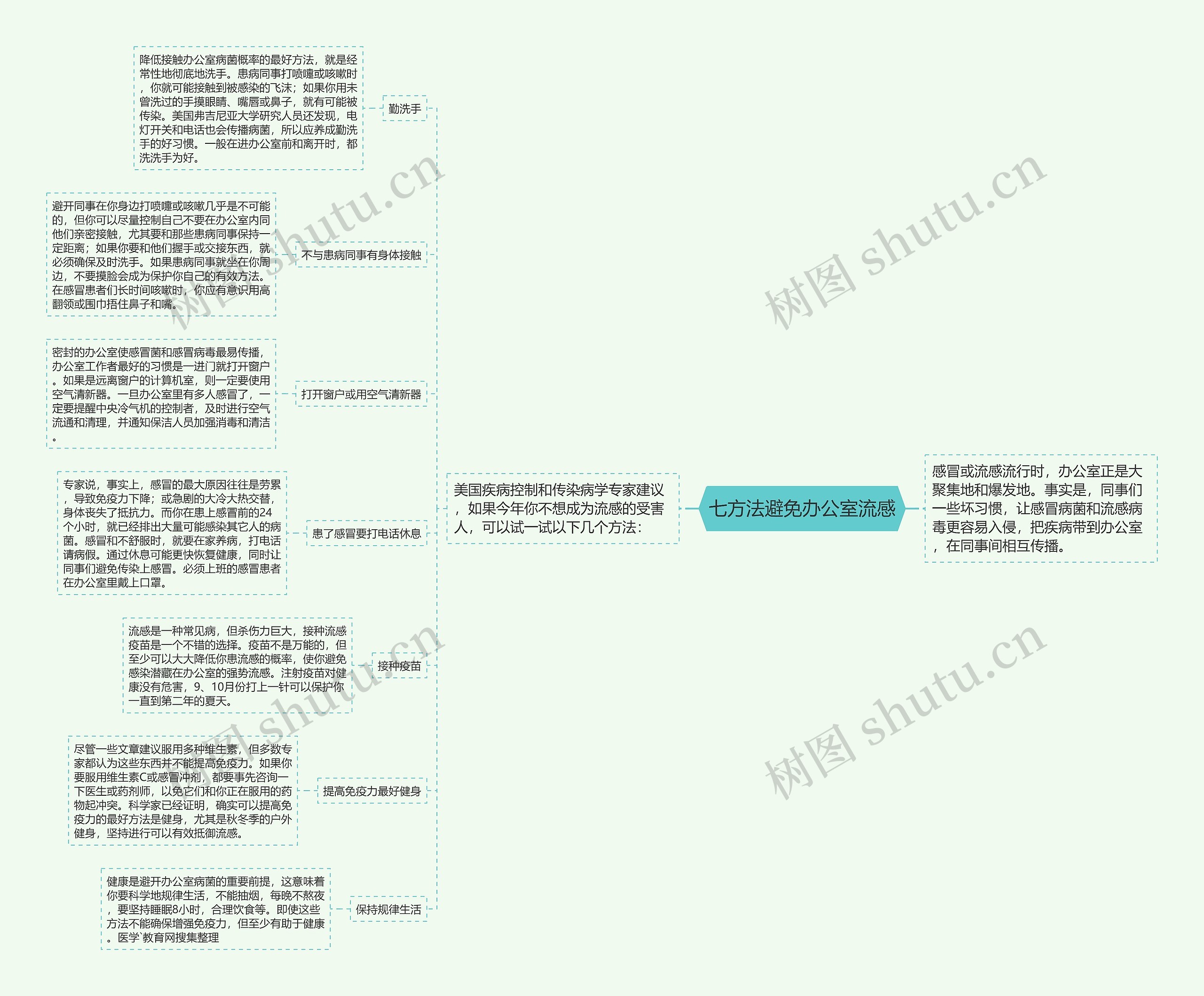 树图思维导图提供《七方法避免办公室流感》在线思维导图免费制作,点击“编辑”按钮,可对《七方法避免办公室流感》进行在线思维导图编辑,本思维导图属于思维导图模板主题,文件编号是:2020ab842b5d9957e0105f9b2d71d9b3