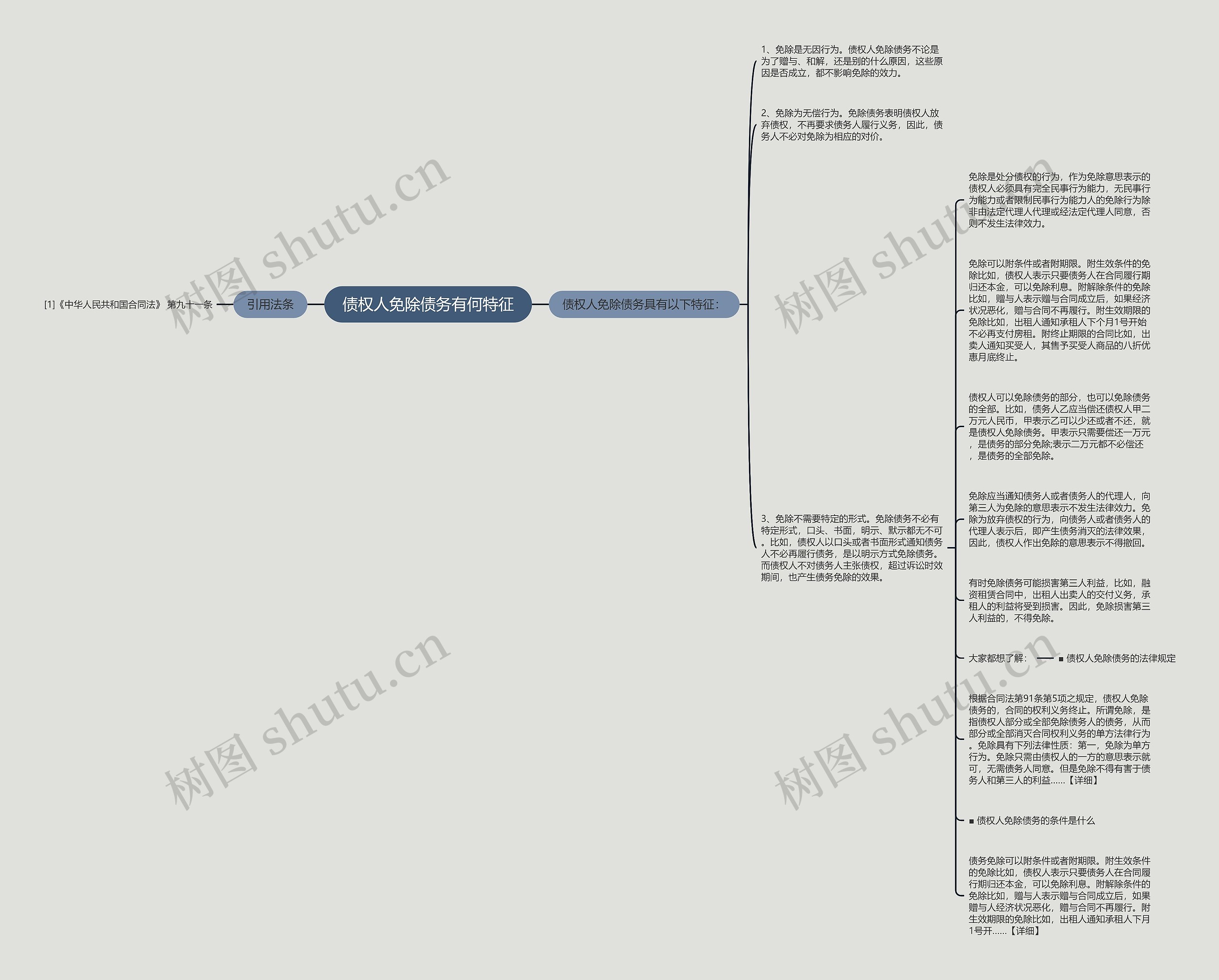 免除可以附条件或者附期限。附生效条件的免除比如,债权人表示只要债务人在合同履行期归还本金,可以免除利息。附解除条件的免除比如,赠与人表示赠与合同成立后,如果经济状况恶化,赠与合同不再履行。附生效期限的免除比如,出租人通知承租人下个月1号开始不必再支付房租。附终止期限的合同比如,出卖人通知买受人,其售予买受人商品的八折优惠月底终止。
