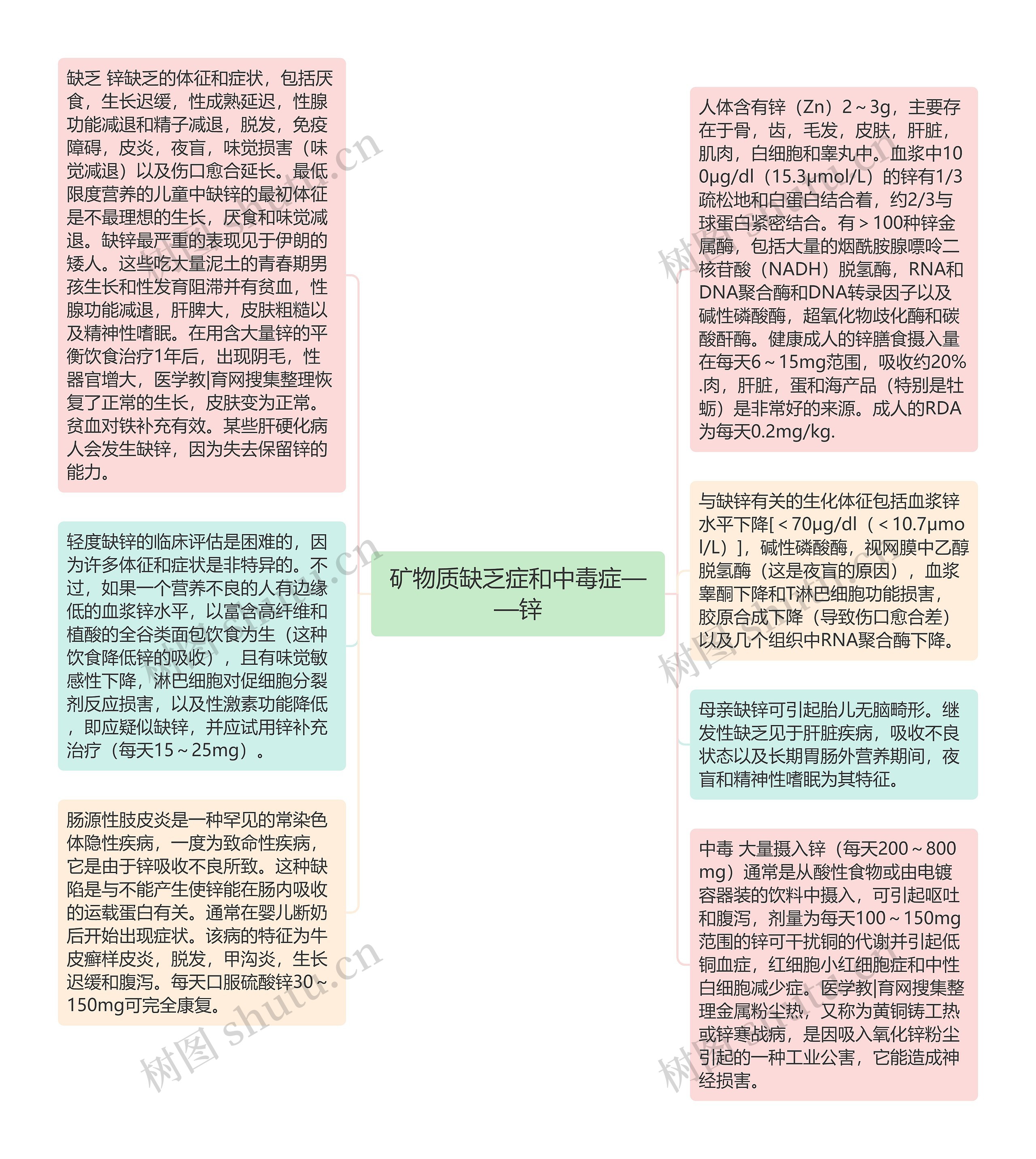 人体含有锌(Zn)2~3g,主要存在于骨,齿,毛发,皮肤,肝脏,肌肉,白细胞和睾丸中。血浆中100μg/dl(15.3μmol/L)的锌有1/3疏松地和白蛋白结合着,约2/3与球蛋白紧密结合。有>100种锌金属酶,包括大量的烟酰胺腺嘌呤二核苷酸(NADH)脱氢酶,RNA和DNA聚合酶和DNA转录因子以及碱性磷酸酶,超氧化物歧化酶和碳酸酐酶。健康成人的锌膳食摄入量在每天6~15mg范围,吸收约20%.肉,肝脏,蛋和海产品(特别是牡蛎)是非常好的来源。成人的RDA为每天0.2mg/kg.