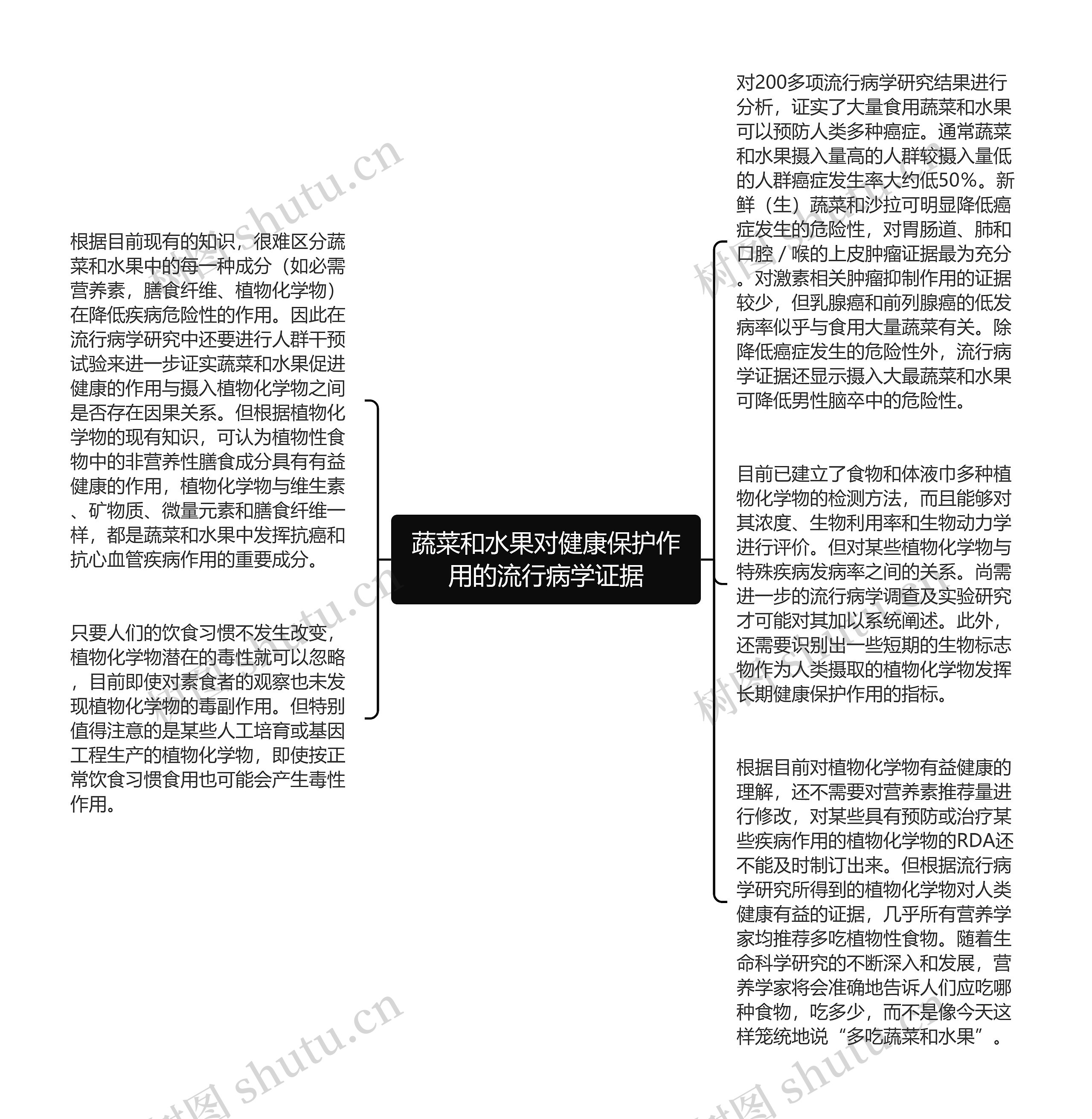对200多项流行病学研究结果进行分析,证实了大量食用蔬菜和水果可以预防人类多种癌症。通常蔬菜和水果摄入量高的人群较摄入量低的人群癌症发生率大约低50%。新鲜(生)蔬菜和沙拉可明显降低癌症发生的危险性,对胃肠道、肺和口腔/喉的上皮肿瘤证据最为充分。对激素相关肿瘤抑制作用的证据较少,但乳腺癌和前列腺癌的低发病率似乎与食用大量蔬菜有关。除降低癌症发生的危险性外,流行病学证据还显示摄入大最蔬菜和水果可降低男性脑卒中的危险性。