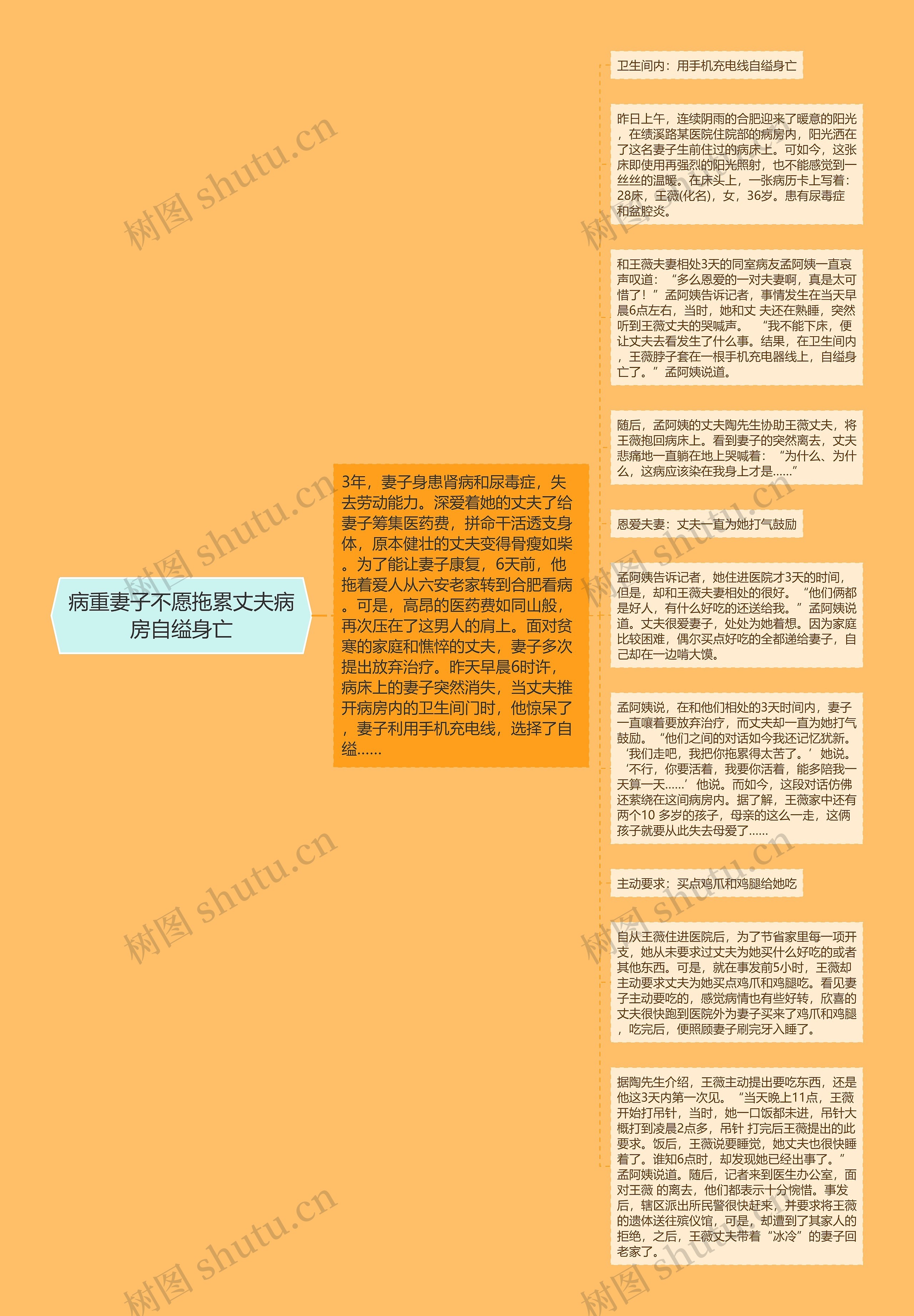 和王薇夫妻相处3天的同室病友孟阿姨一直哀声叹道:“多么恩爱的一对夫妻啊,真是太可惜了!”孟阿姨告诉记者,事情发生在当天早晨6点左右,当时,她和丈 夫还在熟睡,突然听到王薇丈夫的哭喊声。 “我不能下床,便让丈夫去看发生了什么事。结果,在卫生间内,王薇脖子套在一根手机充电器线上,自缢身亡了。”孟阿姨说道。
