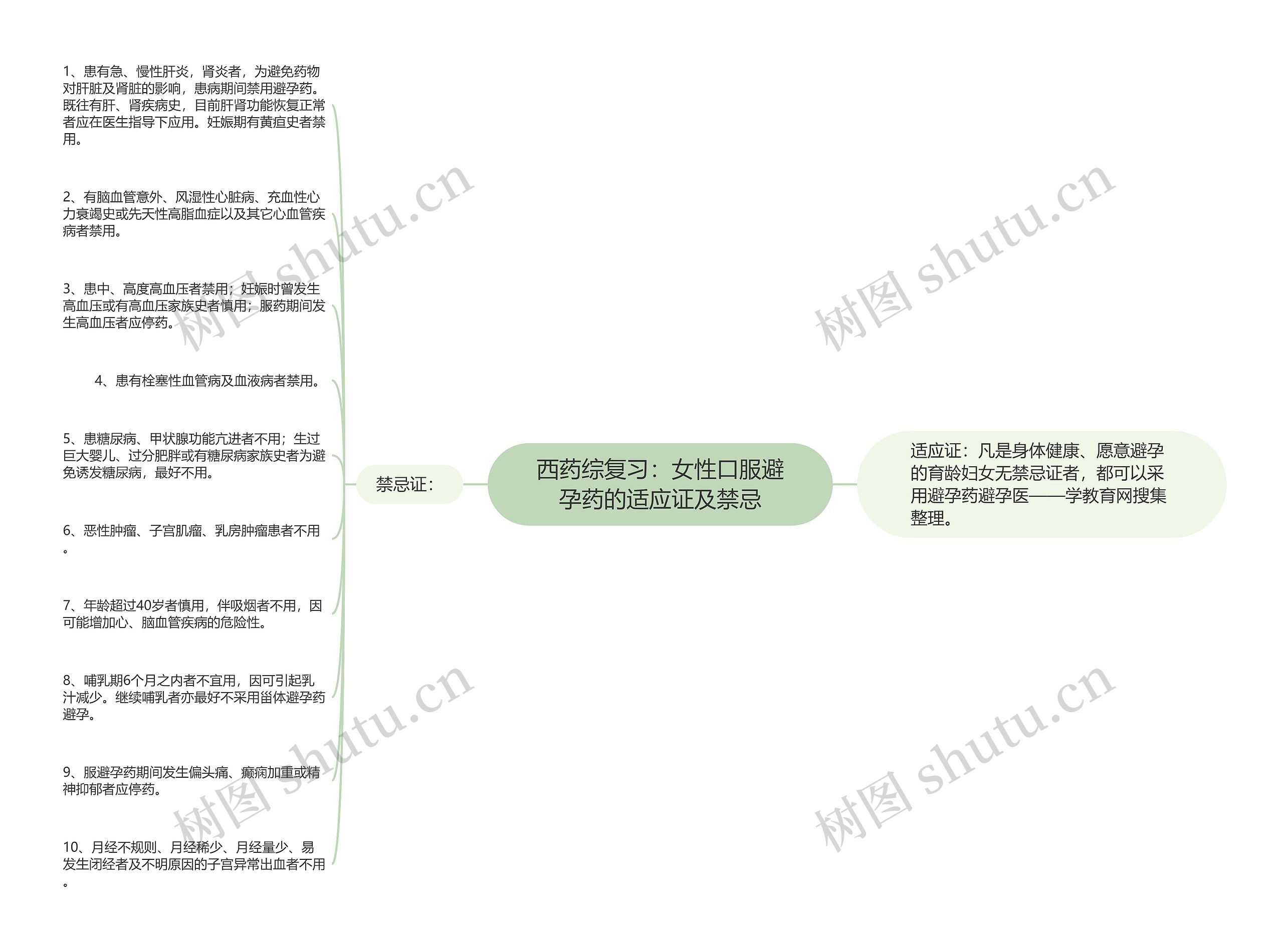 有关西药综复习,以下是树图思维导图小编整理的“女性口服避孕药的适应证及禁忌”,具体相关内容,请考生查看!适应证:凡是身体健康、愿意避孕的育龄妇女无禁忌证者,都可以采用避孕药避孕医——学教育网搜集整理。禁忌证:1、患有急、慢性肝炎,肾炎者,为避免药物对肝脏及肾脏的影响,患病期间禁用避孕药。