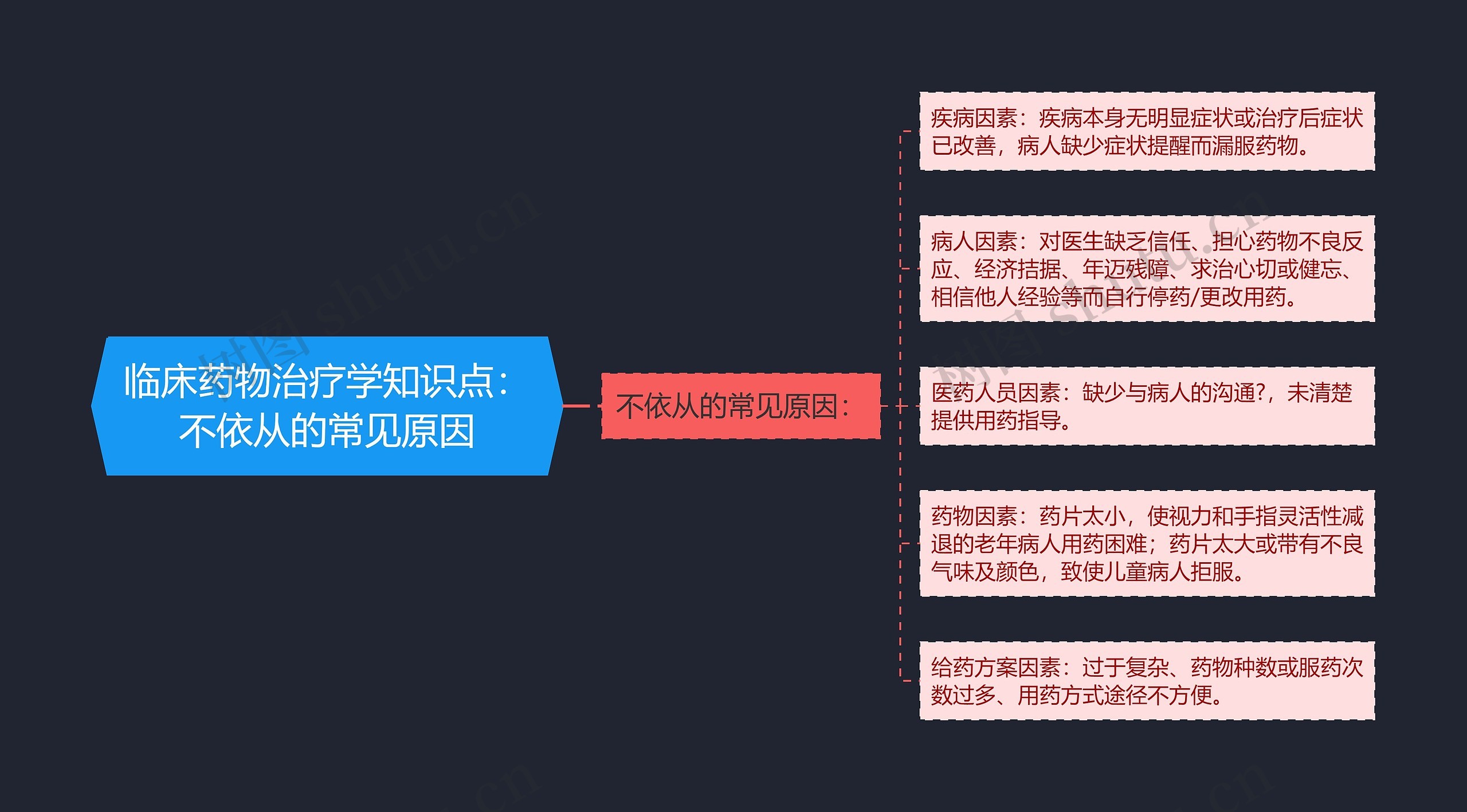 “不依从的常见原因”是临床药物治疗学需要掌握的知识,为帮助大家复习,树图思维导图小编整理内容如下:不依从的常见原因:疾病因素:疾病本身无明显症状或治疗后症状已改善,病人缺少症状提醒而漏服药物。