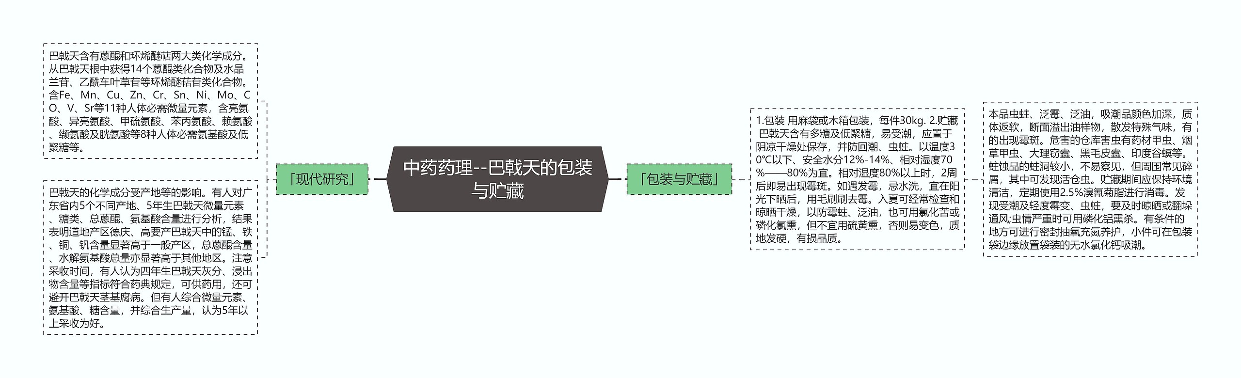 树图思维导图小编为帮助广大考生顺利通过考试,特为大家整理了“中药药理--巴戟天的包装与贮藏”相关内容,详细如下:「包装与贮藏」1.包装 用麻袋或木箱包装,每件30kg. 2.贮藏 巴戟天含有多糖及低聚糖,易受潮,应置于阴凉干燥处保存,并防回潮、虫蛀。以温度30℃以下、安全水分12%-14%、相对湿度70%——80%为宜。