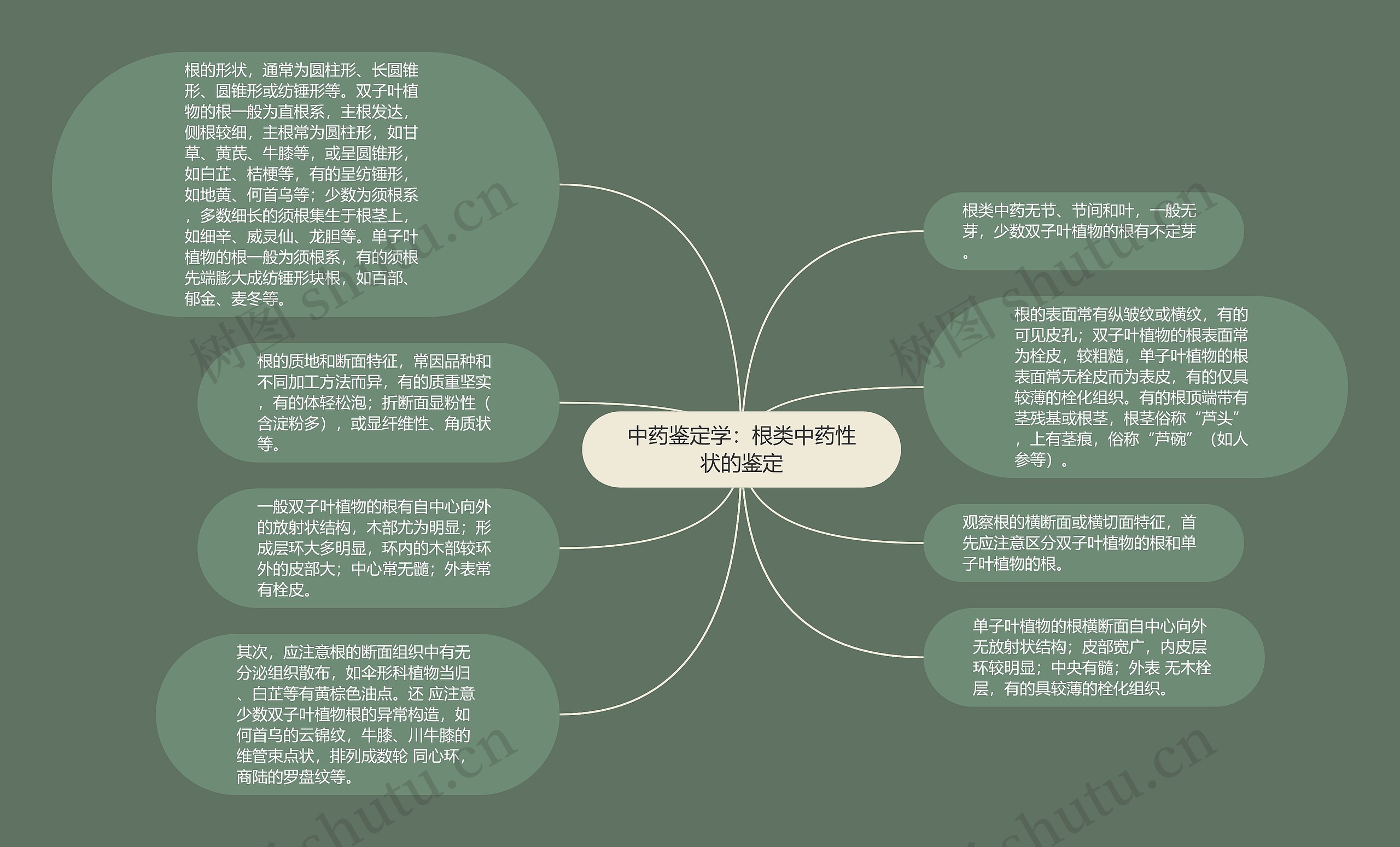 根的形状,通常为圆柱形、长圆锥形、圆锥形或纺锤形等。双子叶植物的根一般为直根系,主根发达,侧根较细,主根常为圆柱形,如甘草、黄芪、牛膝等,或呈圆锥形,如白芷、桔梗等,有的呈纺锤形,如地黄、何首乌等;少数为须根系,多数细长的须根集生于根茎上,如细辛、威灵仙、龙胆等。单子叶植物的根一般为须根系,有的须根先端膨大成纺锤形块根,如百部、郁金、麦冬等。