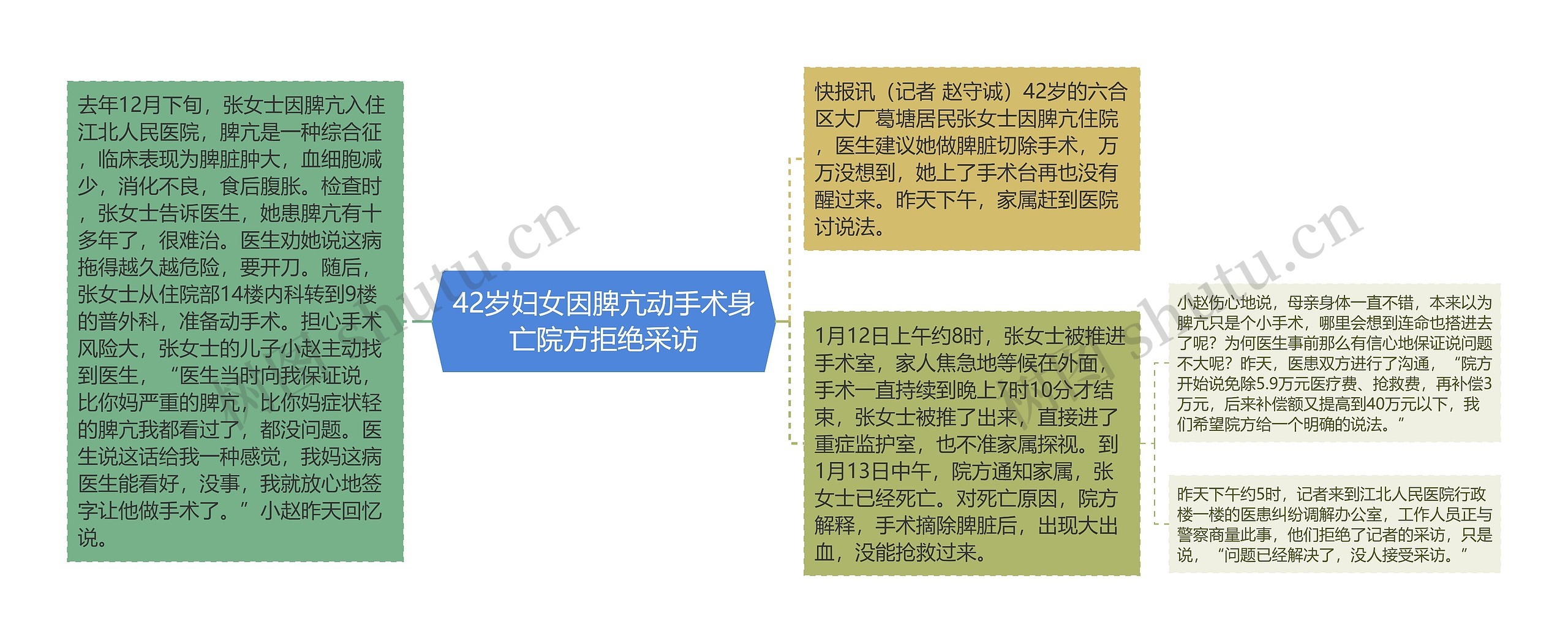 树图思维导图提供《42岁妇女因脾亢动手术身亡院方拒绝采访》在线思维导图免费制作,点击“编辑”按钮,可对《42岁妇女因脾亢动手术身亡院方拒绝采访》进行在线思维导图编辑,本思维导图属于思维导图模板主题,文件编号是:696612c4a1d5e19db3e9ec736f6a01c0