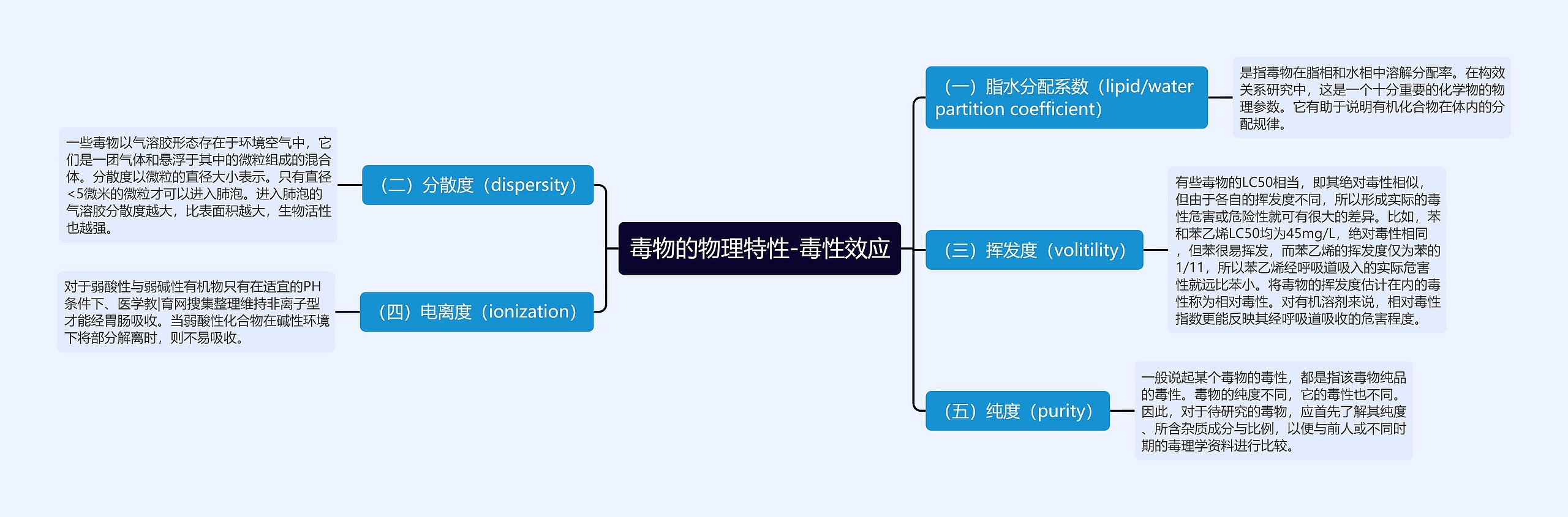 很多考生想知道如何高效的进行备考,树图思维导图搜集整理药物毒理学知识点“毒物的物理特性-毒性效应”,详细内容如下,希望能帮助广大考生顺利通过考试! (一)脂水分配系数(lipid/water partition coefficient) 是指毒物在脂相和水相中溶解分配率。在构效关系研究中,这是一个十分重要的化学物的物理参数。