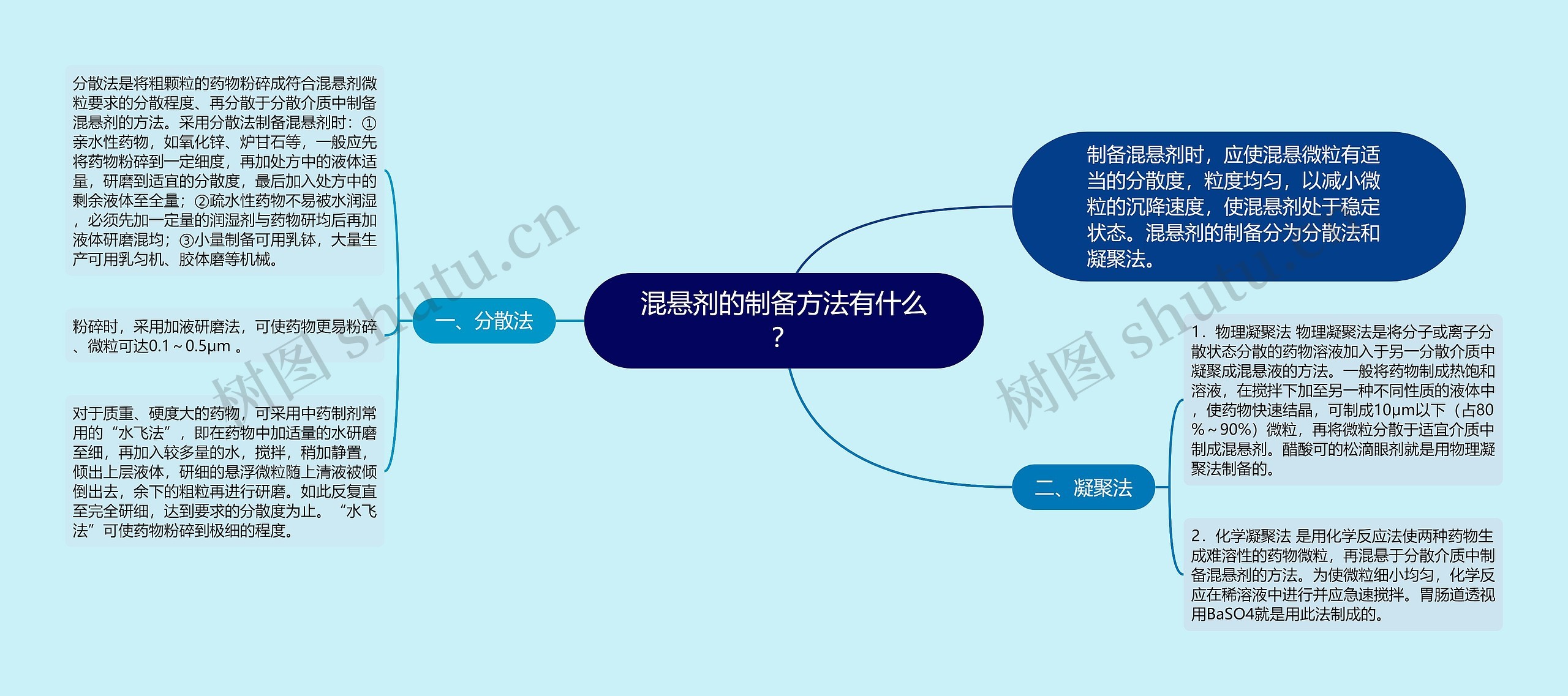 混悬剂的制备方法有什么?为了帮助大家了解,树图思维导图为大家搜集整理如下: 制备混悬剂时,应使混悬微粒有适当的分散度,粒度均匀,以减小微粒的沉降速度,使混悬剂处于稳定状态。混悬剂的制备分为分散法和凝聚法。
