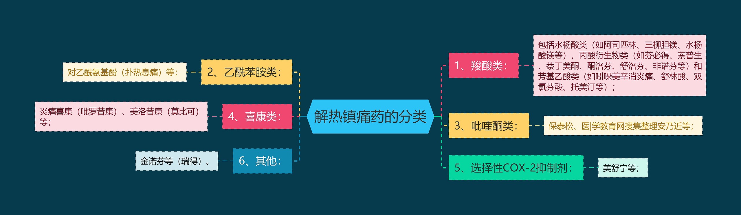 解热镇痛药的分类是什么?为了帮助大家了解,树图思维导图为大家搜集整理如下: 1、羧酸类: 包括水杨酸类(如阿司匹林、三柳胆镁、水杨酸镁等),丙酸衍生物类(如芬必得、萘普生、萘丁美酮、酮洛芬、舒洛芬、非诺芬等)和芳基乙酸类(如吲哚美辛消炎痛、舒林酸、双氯芬酸、托美汀等); 2、乙酰苯胺类: 对乙酰氨基酚(扑热