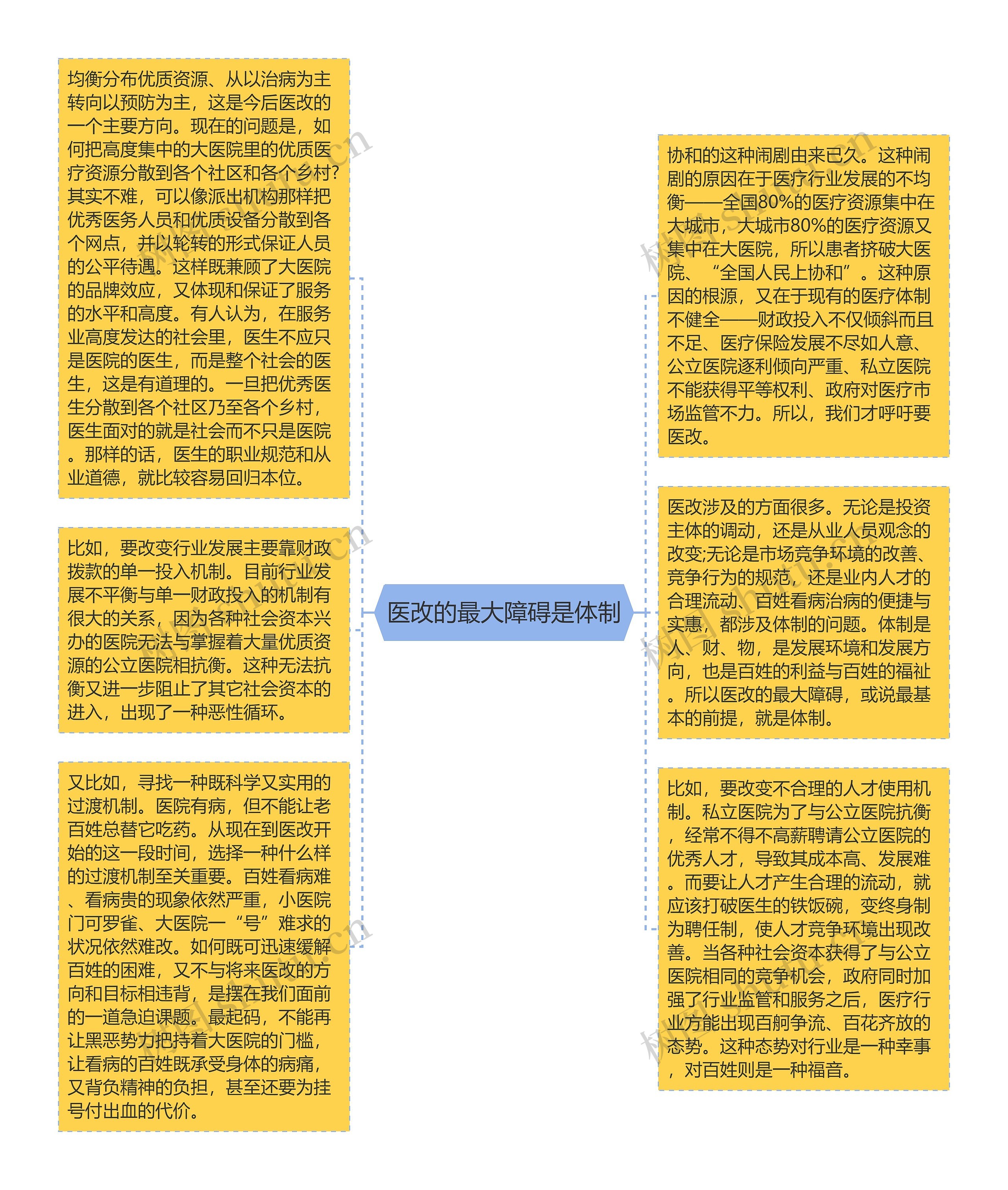医改涉及的方面很多。无论是投资主体的调动,还是从业人员观念的改变;无论是市场竞争环境的改善、竞争行为的规范,还是业内人才的合理流动、百姓看病治病的便捷与实惠,都涉及体制的问题。体制是人、财、物,是发展环境和发展方向,也是百姓的利益与百姓的福祉。所以医改的最大障碍,或说最基本的前提,就是体制。