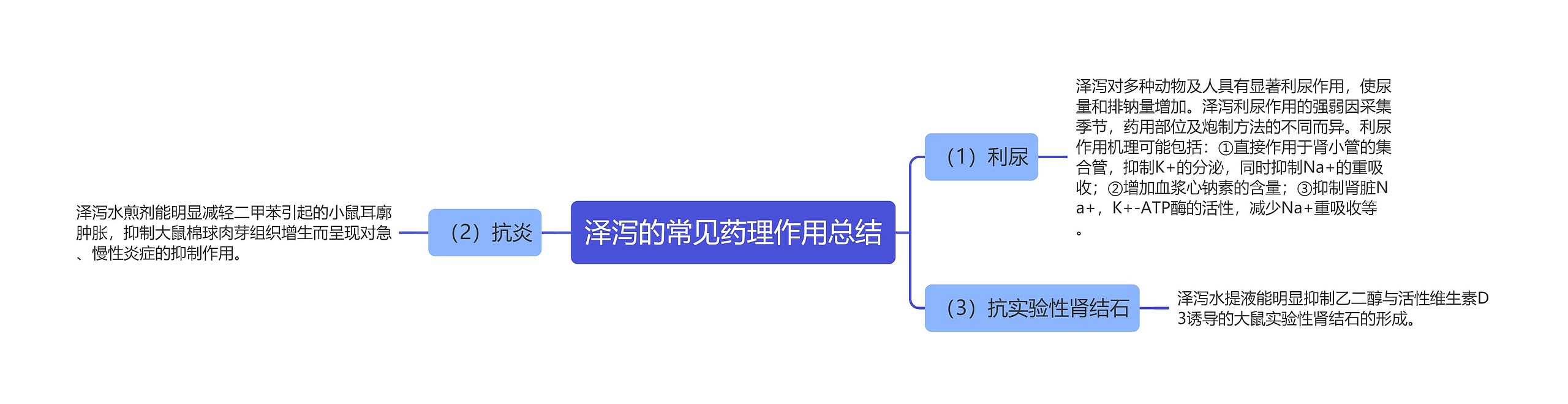 树图思维导图小编整理了泽泻的常见药理作用总结如下,请各位考生仔细查看。 (1)利尿 泽泻对多种动物及人具有显著利尿作用,使尿量和排钠量增加。泽泻利尿作用的强弱因采集季节,药用部位及炮制方法的不同而异。