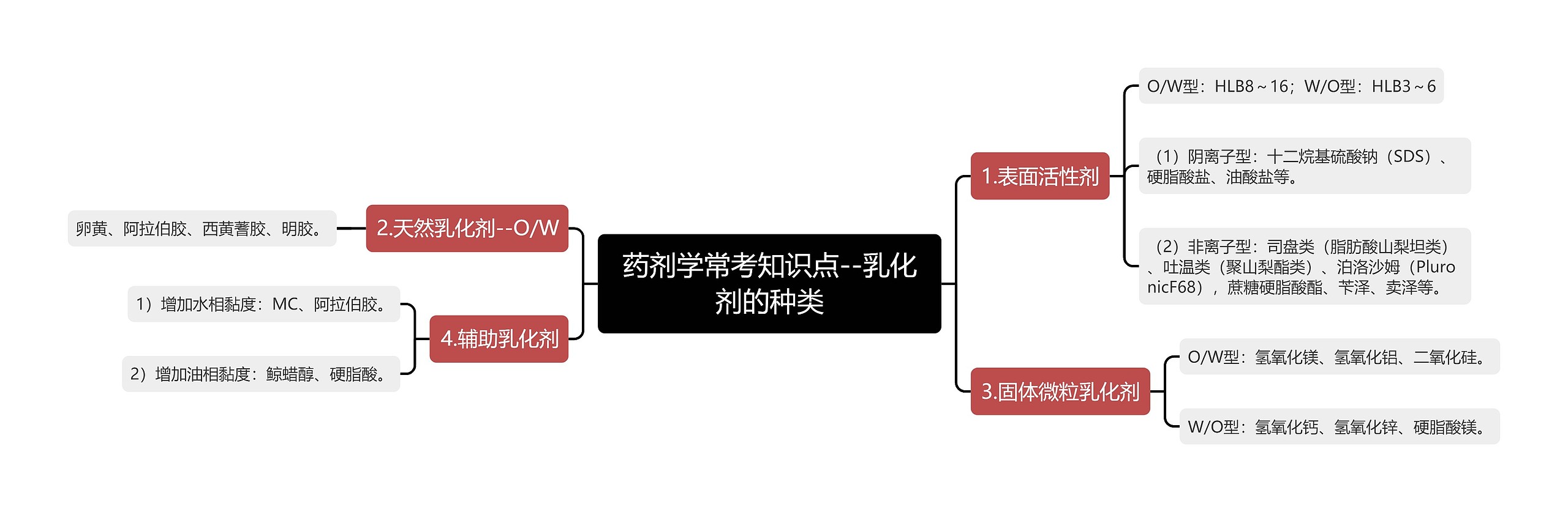 乳化剂的种类是药剂学常考知识点,相信很多执业药师考生们都想知道,为了帮助大家了解,小编为大家整理出如下相关介绍: 1.表面活性剂 O/W型:HLB8~16;W/O型:HLB3~6 注意:关于W/O的HLB值前后不一致,大家一定要注意。医学|教育|网搜集整理 (1)阴离子型:十二烷基硫酸钠(SDS)、硬脂酸盐、油酸盐等。