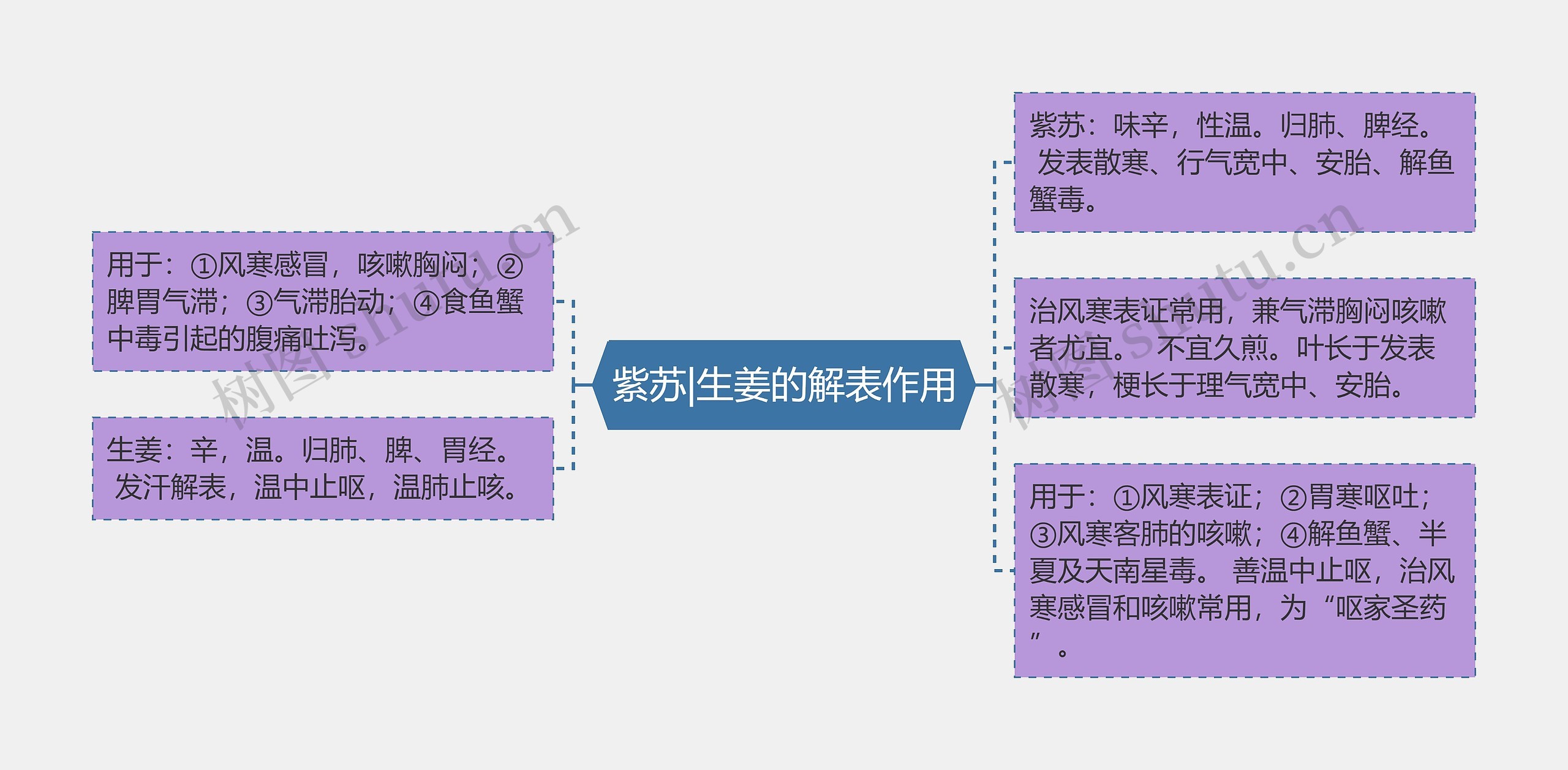 紫苏:味辛,性温。归肺、脾经。 发表散寒、行气宽中、安胎、解鱼蟹毒。 用于:①风寒感冒,咳嗽胸闷;②脾胃气滞;③气滞胎动;④食鱼蟹中毒引起的腹痛吐泻。 治风寒表证常用,兼气滞胸闷咳嗽者尤宜。 不宜久煎。叶长于发表散寒,梗长于理气宽中、安胎。 生姜:辛,温。归肺、脾、胃经。