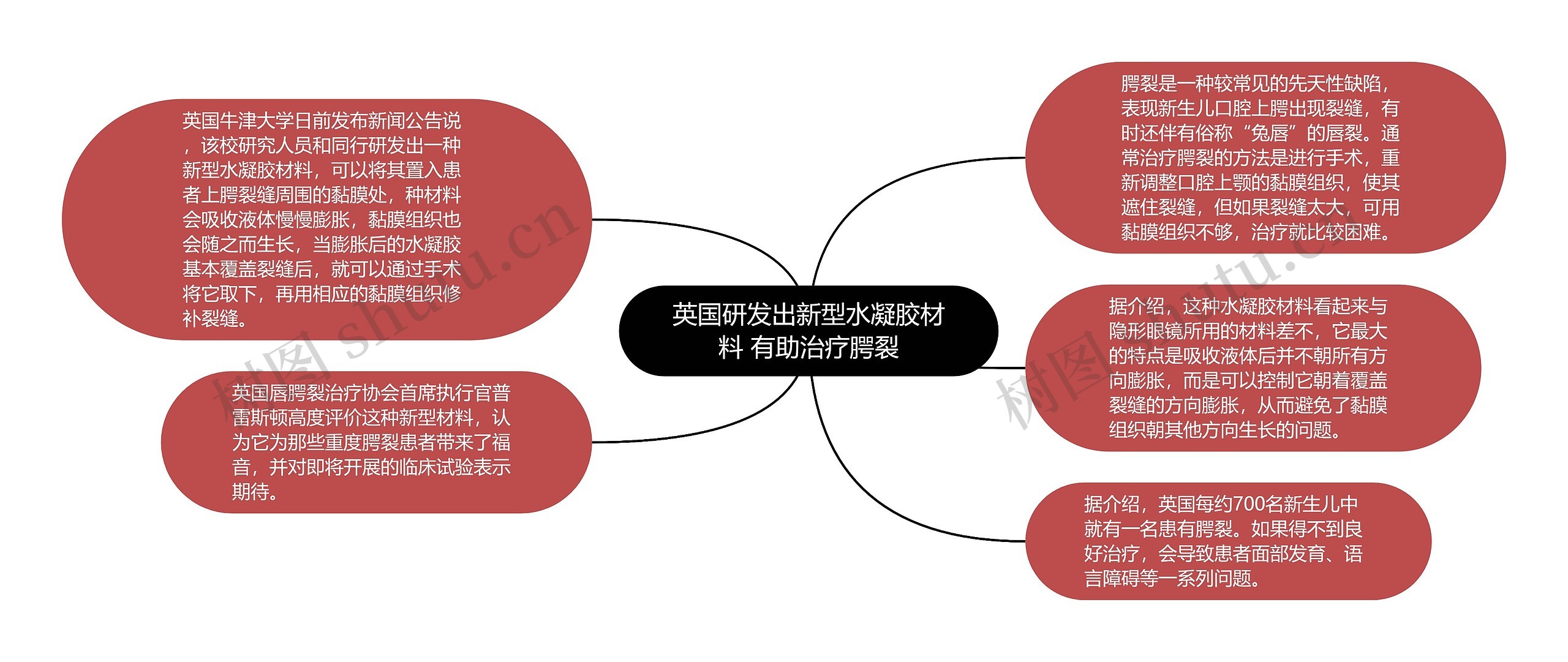 英国牛津大学日前发布新闻公告说,该校研究人员和同行研发出一种新型水凝胶材料,可以将其置入患者上腭裂缝周围的黏膜处,种材料会吸收液体慢慢膨胀,黏膜组织也会随之而生长,当膨胀后的水凝胶基本覆盖裂缝后,就可以通过手术将它取下,再用相应的黏膜组织修补裂缝。