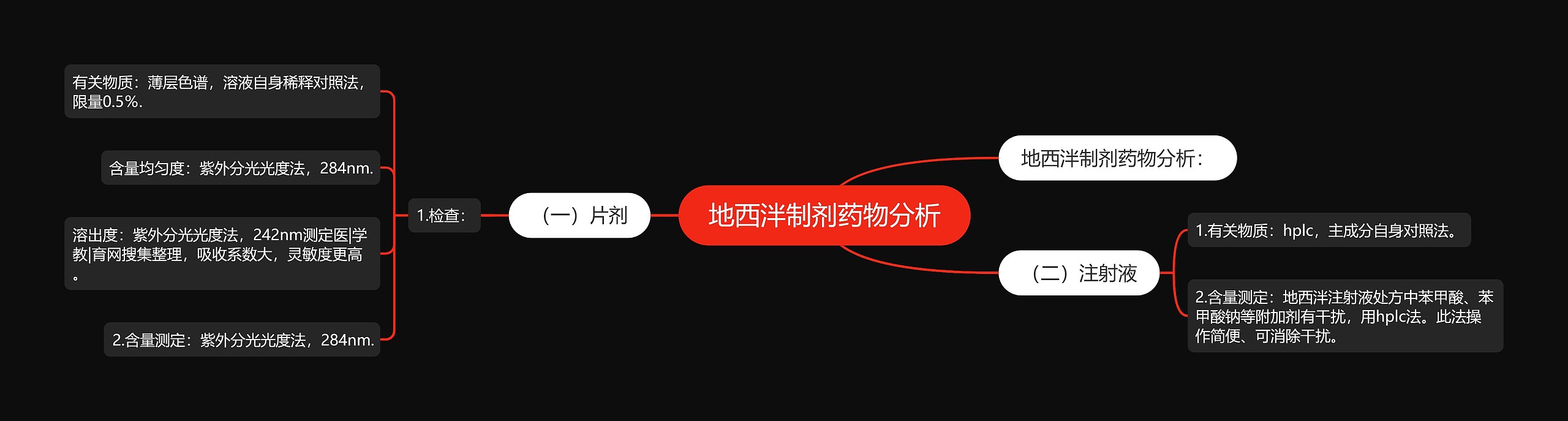 地西泮制剂药物分析: (一)片剂 1.检查: 有关物质:薄层色谱,溶液自身稀释对照法,限量0.5%. 含量均匀度:紫外分光光度法,284nm. 溶出度:紫外分光光度法,242nm测定医|学教|育网搜集整理,吸收系数大,灵敏度更高。 2.含量测定:紫外分光光度法,284nm. (二)注射液 1.有关物质:hplc,主成分自身对照法。