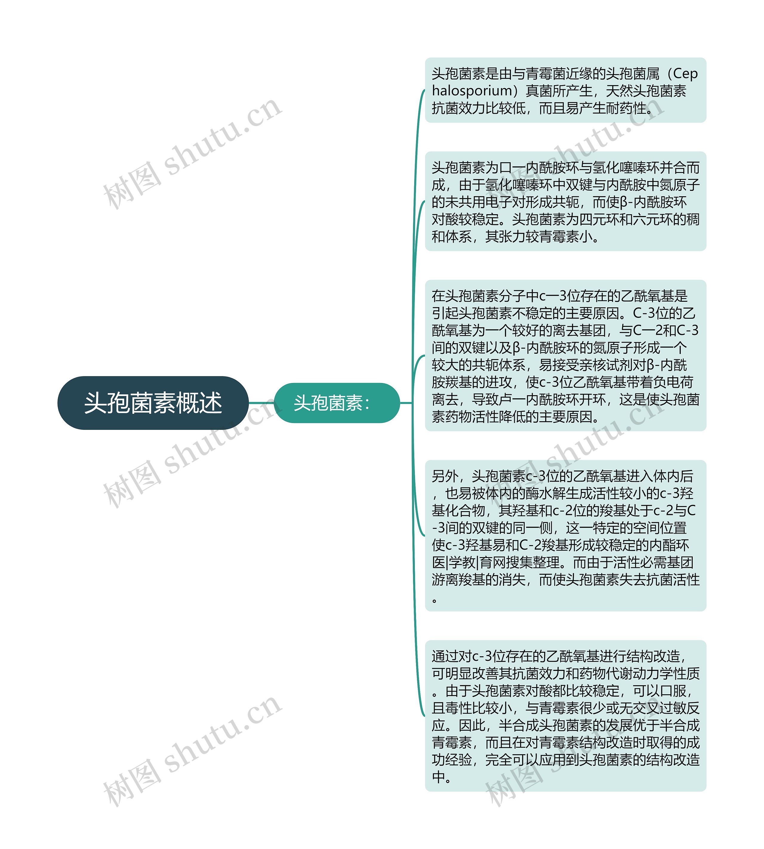 头孢菌素为口一内酰胺环与氢化噻嗪环并合而成,由于氢化噻嗪环中双键与内酰胺中氮原子的未共用电子对形成共轭,而使β-内酰胺环对酸较稳定。头孢菌素为四元环和六元环的稠和体系,其张力较青霉素小。