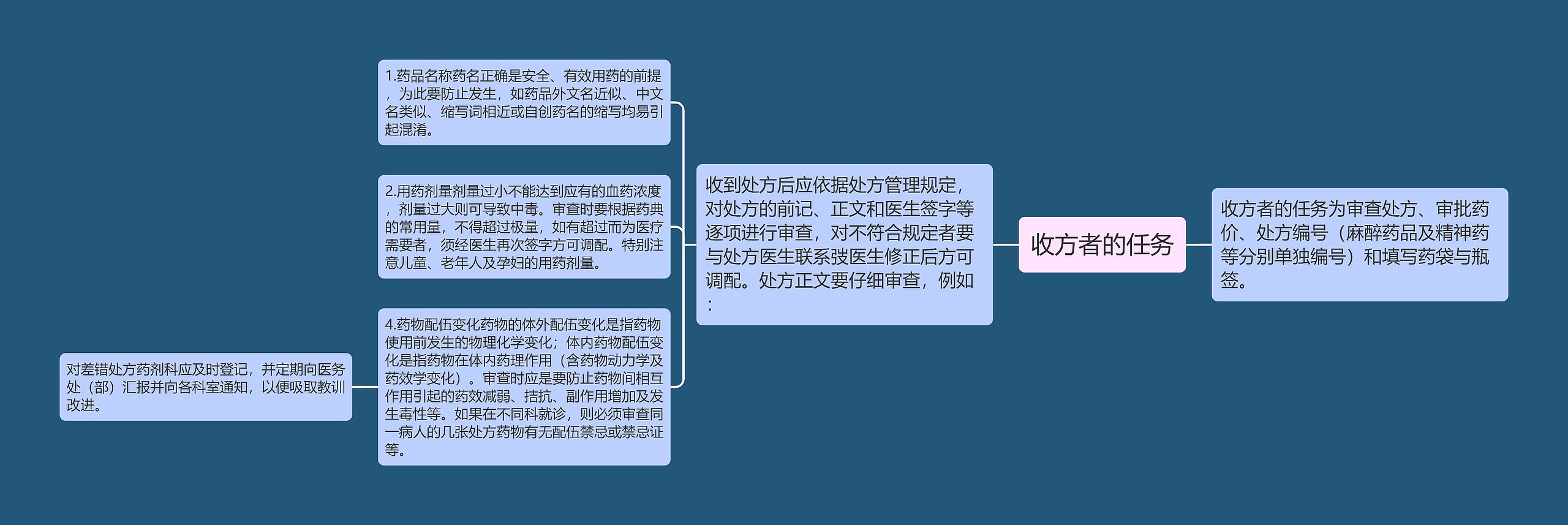 收方者的任务为审查处方、审批药价、处方编号(麻醉药品及精神药等分别单独编号)和填写药袋与瓶签。 收到处方后应依据处方管理规定,对处方的前记、正文和医生签字等逐项进行审查,对不符合规定者要与处方医生联系弢医生修正后方可调配。