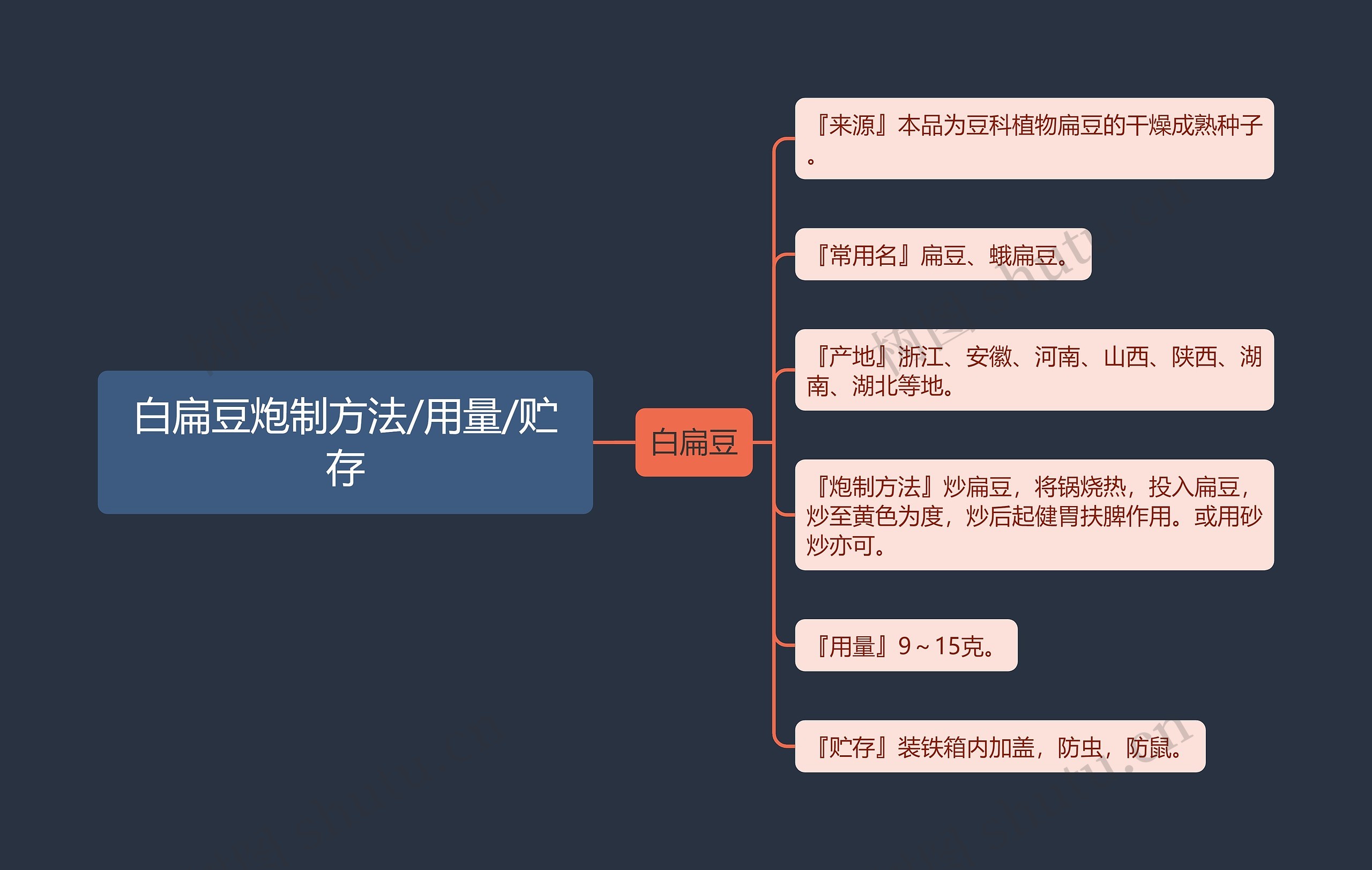 树图思维导图提供《白扁豆炮制方法/用量/贮存》在线思维导图免费制作,点击“编辑”按钮,可对《白扁豆炮制方法/用量/贮存》进行在线思维导图编辑,本思维导图属于思维导图模板主题,文件编号是:638b4f7a886325a62639250757f60f22