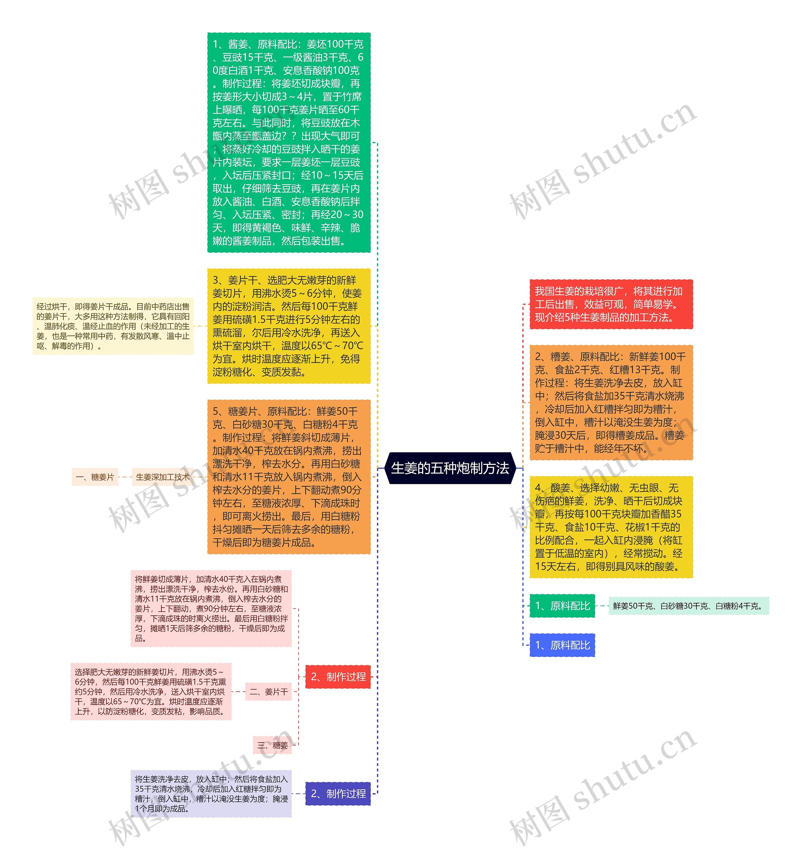 2、糟姜、原料配比:新鲜姜100千克、食盐2千克、红糟13千克。制作过程:将生姜洗净去皮,放入缸中;然后将食盐加35千克清水烧沸,冷却后加入红糟拌匀即为糟汁,倒入缸中,糟汁以淹没生姜为度;腌浸30天后,即得糟姜成品。糟姜贮于糟汁中,能经年不坏。