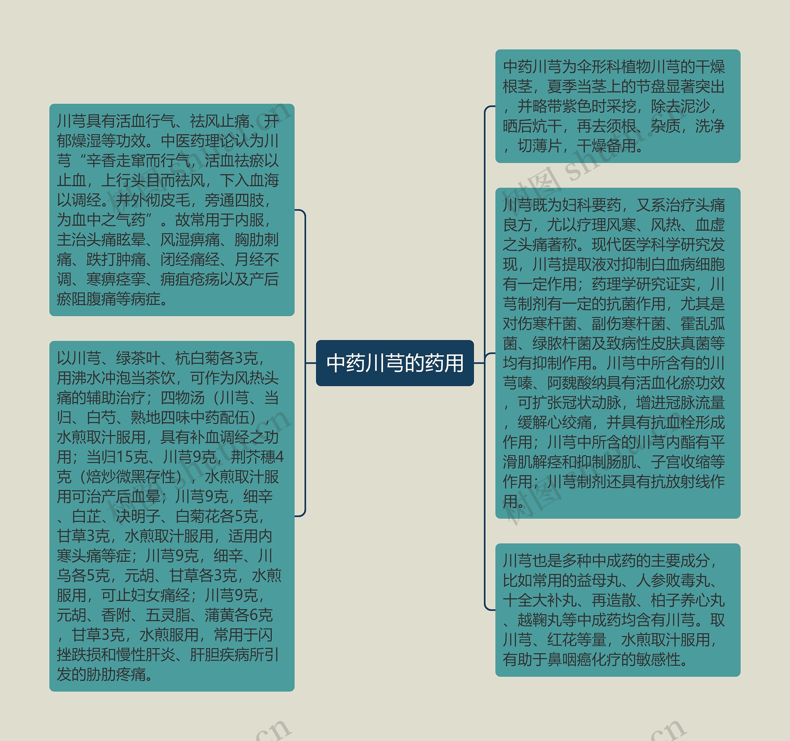 川芎具有活血行气、祛风止痛、开郁燥湿等功效。中医药理论认为川芎“辛香走窜而行气,活血祛瘀以止血,上行头目而祛风,下入血海以调经。并外彻皮毛,旁通四肢,为血中之气药”。故常用于内服,主治头痛眩晕、风湿痹痛、胸肋刺痛、跌打肿痛、闭经痛经、月经不调、寒痹痉挛、痈疽疮疡以及产后瘀阻腹痛等病症。