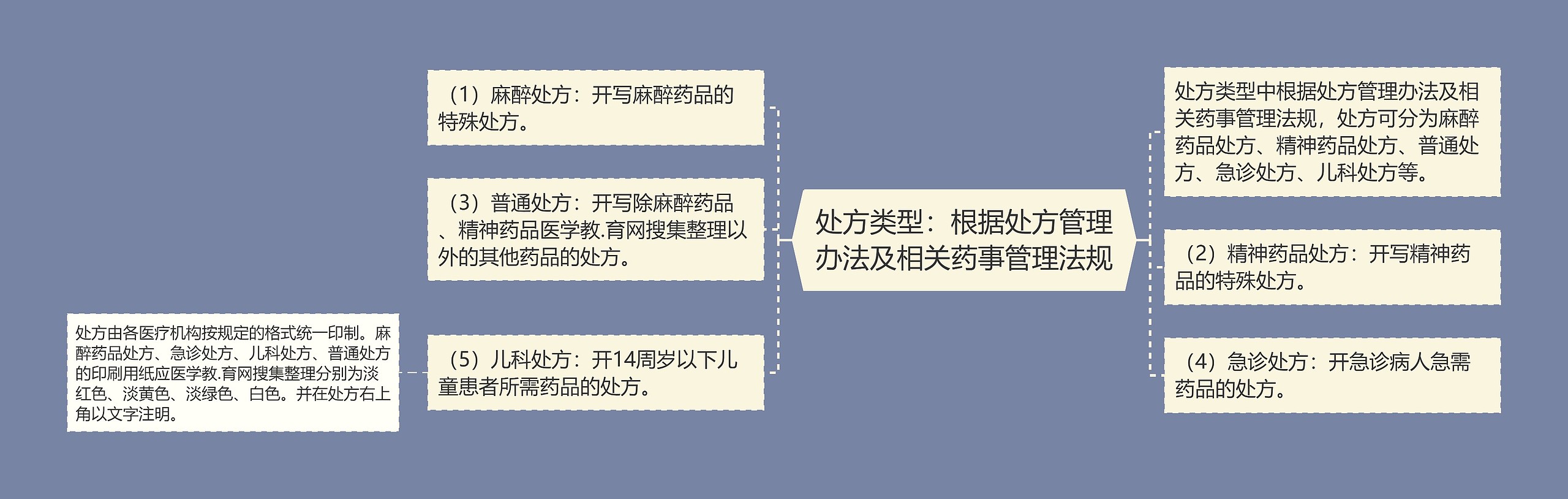 处方类型中根据处方管理办法及相关药事管理法规,处方可分为麻醉药品处方、精神药品处方、普通处方、急诊处方、儿科处方等。 (1)麻醉处方:开写麻醉药品的特殊处方。 (2)精神药品处方:开写精神药品的特殊处方。 (3)普通处方:开写除麻醉药品、精神药品医学教.育网搜集整理以外的其他药品的处方。