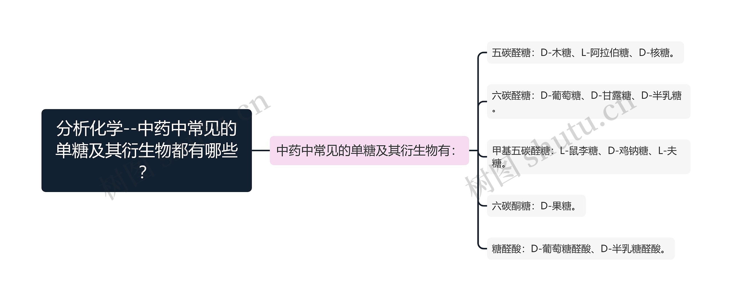有关分析化学,以下是小编整理的“分析化学--中药中常见的单糖及其衍生物都有哪些?”,具体内容如下,请考生查看!中药中常见的单糖及其衍生物有:五碳醛糖:D-木糖、L-阿拉伯糖、D-核糖。六碳醛糖:D-葡萄糖、D-甘露糖、D-半乳糖。甲基五碳醛糖:L-鼠李糖、D-鸡钠糖、L-夫糖。六碳酮糖:D-果糖。