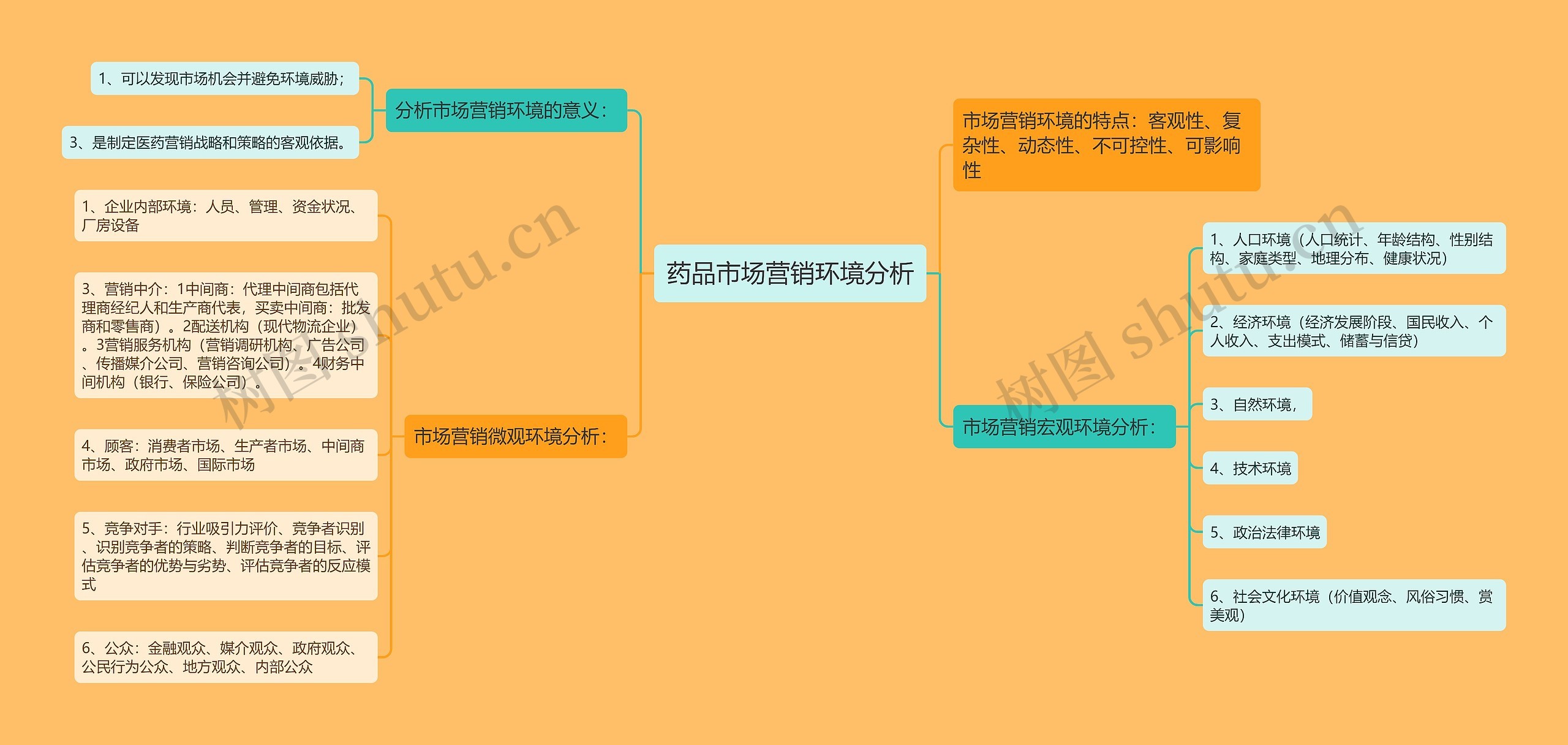 市场营销环境的特点:客观性、复杂性、动态性、不可控性、可影响性 分析市场营销环境的意义: 1、可以发现市场机会并避免环境威胁; 2、是企业营销活动的基础树图思维导图搜集整理; 3、是制定医药营销战略和策略的客观依据。
