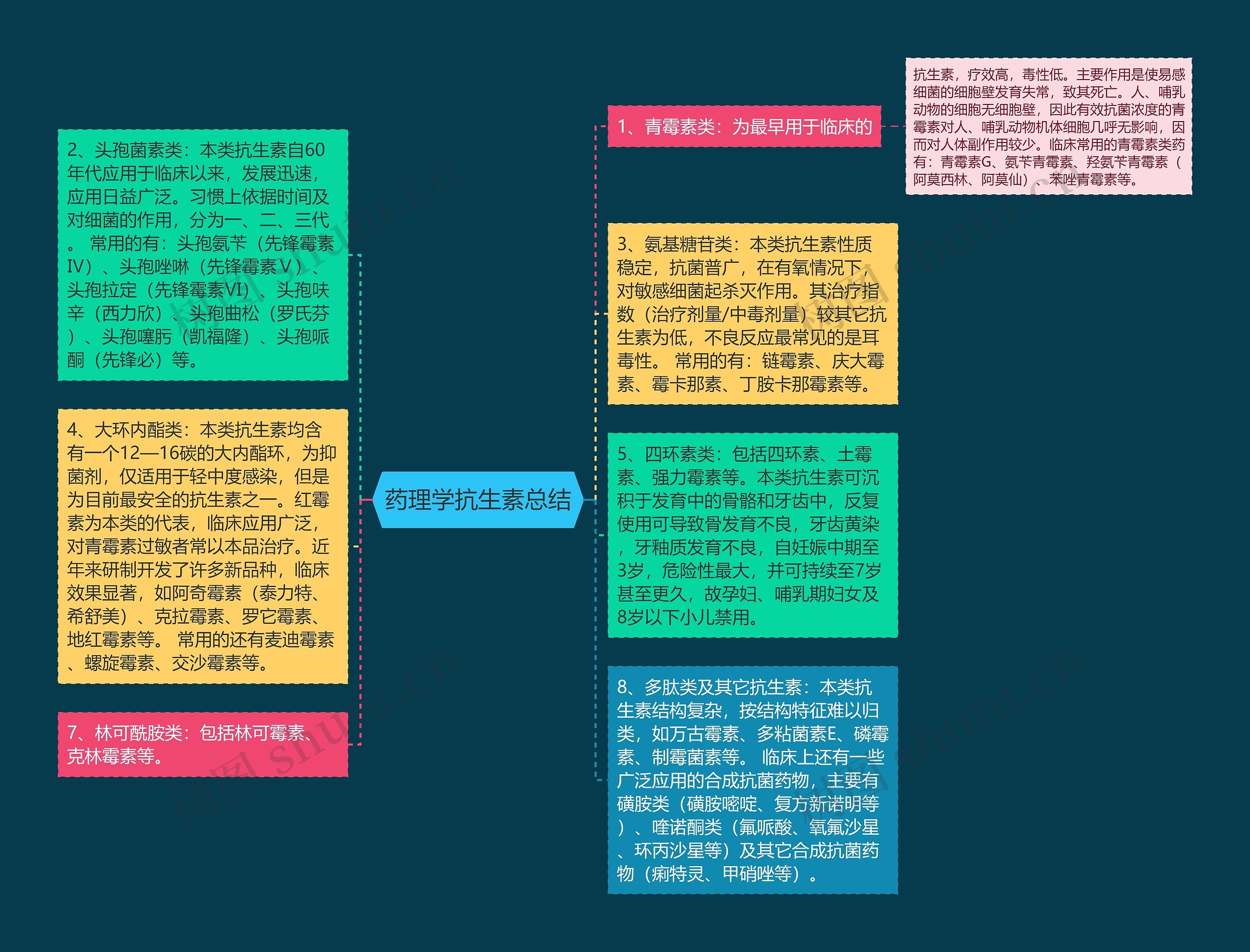 8、多肽类及其它抗生素:本类抗生素结构复杂,按结构特征难以归类,如万古霉素、多粘菌素E、磷霉素、制霉菌素等。 临床上还有一些广泛应用的合成抗菌药物,主要有磺胺类(磺胺嘧啶、复方新诺明等)、喹诺酮类(氟哌酸、氧氟沙星、环丙沙星等)及其它合成抗菌药物(痢特灵、甲硝唑等)。
