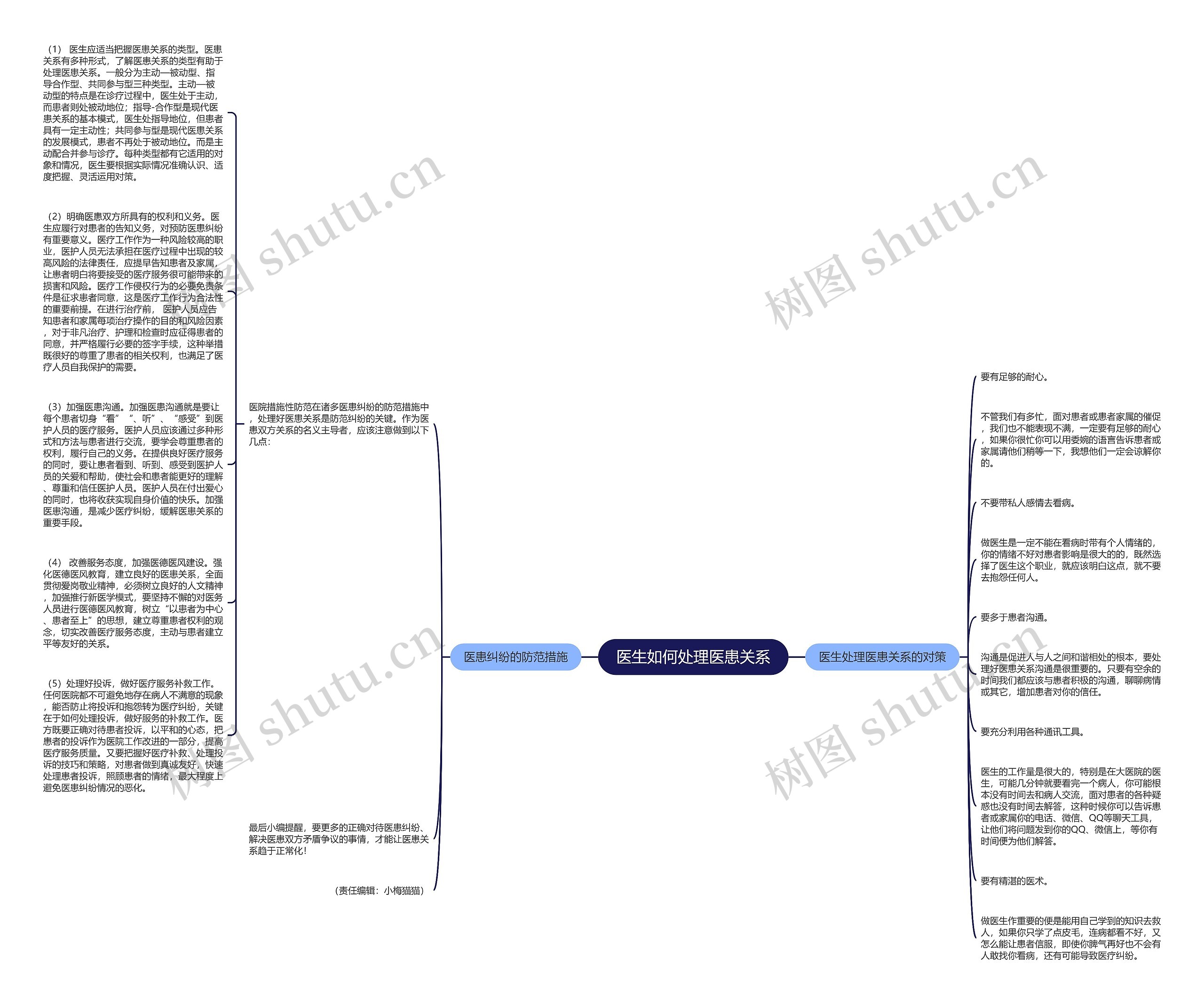 (1) 医生应适当把握医患关系的类型。医患关系有多种形式,了解医患关系的类型有助于处理医患关系。一般分为主动—被动型、指导合作型、共同参与型三种类型。主动—被动型的特点是在诊疗过程中,医生处于主动,而患者则处被动地位;指导-合作型是现代医患关系的基本模式,医生处指导地位,但患者具有一定主动性;共同参与型是现代医患关系的发展模式,患者不再处于被动地位。而是主动配合并参与诊疗。每种类型都有它适用的对象和情况,医生要根据实际情况准确认识、适度把握、灵活运用对策。
