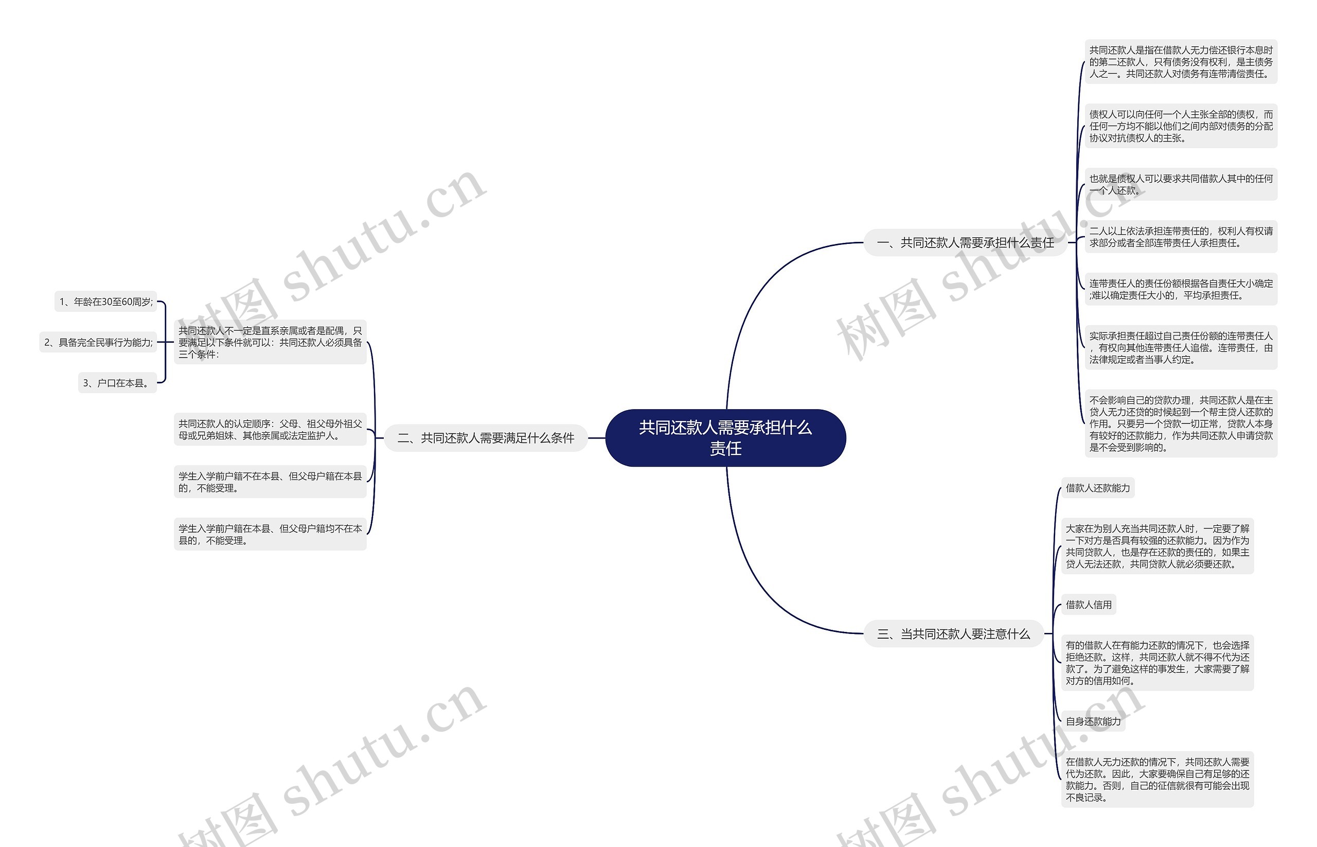 树图思维导图提供《共同还款人需要承担什么责任》在线思维导图免费制作,点击“编辑”按钮,可对《共同还款人需要承担什么责任》进行在线思维导图编辑,本思维导图属于思维导图模板主题,文件编号是:cc06d05c021ed3df7a2acd98962b60e2