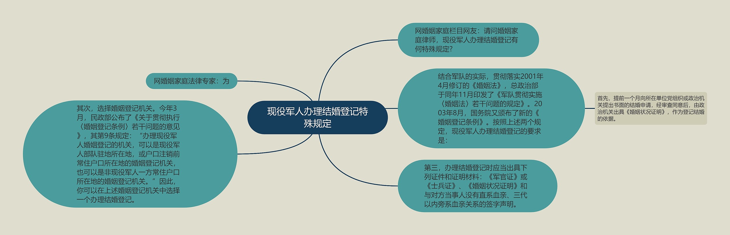 树图思维导图提供《现役军人办理结婚登记特殊规定》在线思维导图免费制作,点击“编辑”按钮,可对《现役军人办理结婚登记特殊规定》进行在线思维导图编辑,本思维导图属于思维导图模板主题,文件编号是:3c9b8a31e1b435e4cc8c76227e510b57