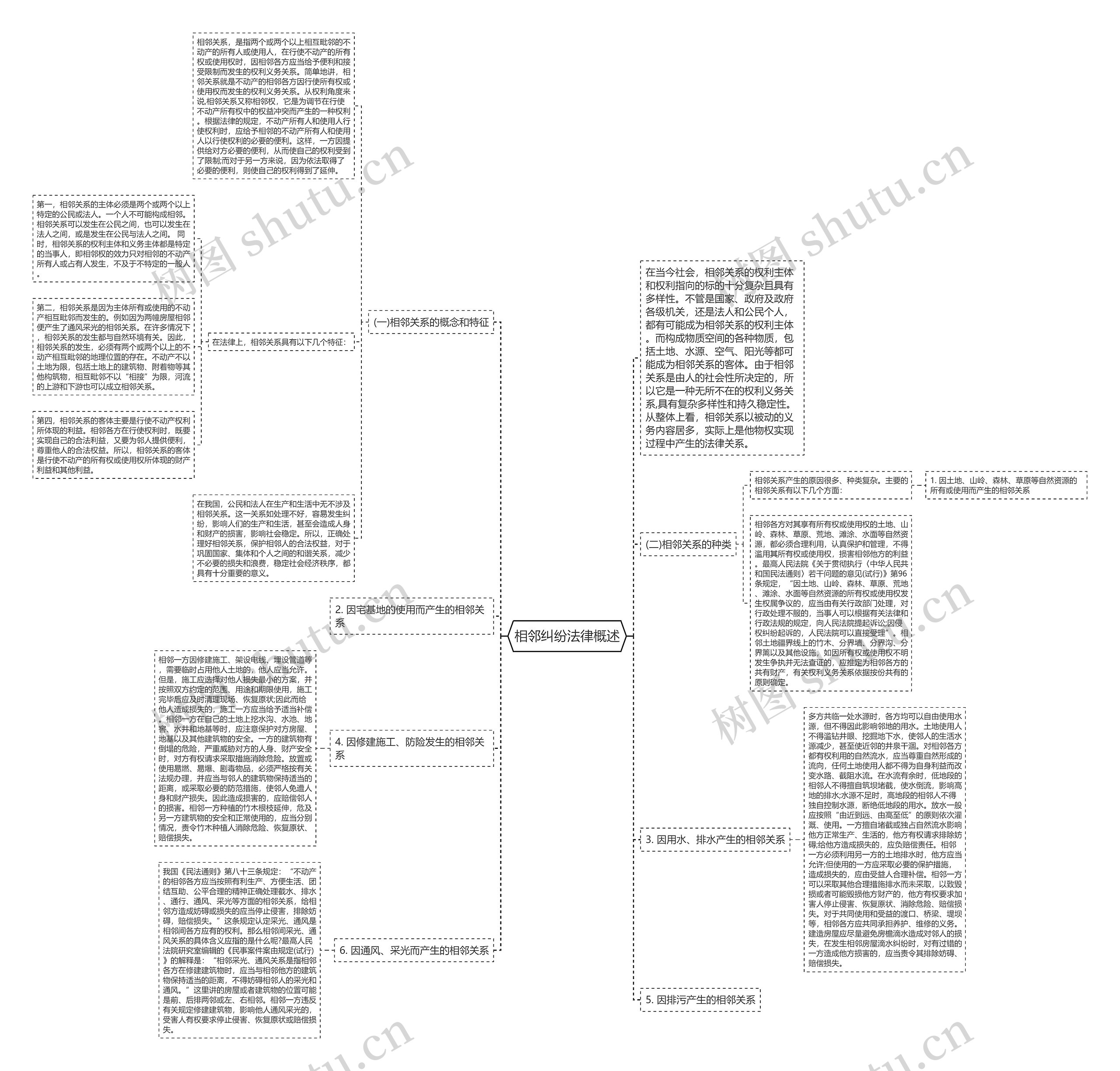 相邻关系,是指两个或两个以上相互毗邻的不动产的所有人或使用人,在行使不动产的所有权或使用权时,因相邻各方应当给予便利和接受限制而发生的权利义务关系。简单地讲,相邻关系就是不动产的相邻各方因行使所有权或使用权而发生的权利义务关系。从权利角度来说,相邻关系又称相邻权,它是为调节在行使不动产所有权中的权益冲突而产生的一种权利。根据法律的规定,不动产所有人和使用人行使权利时,应给予相邻的不动产所有人和使用人以行使权利的必要的便利。这样,一方因提供给对方必要的便利,从而使自己的权利受到了限制;而对于另一方来说,因为依法取得了必要的便利,则使自己的权利得到了延伸。