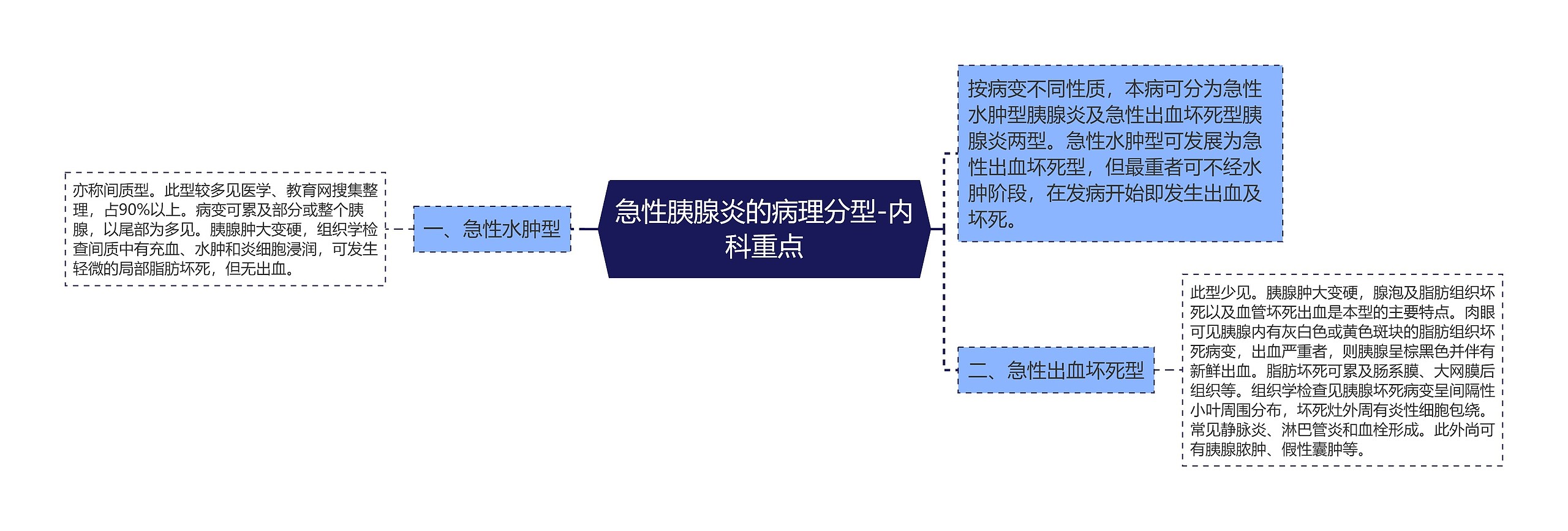 急性胰腺炎的病理分型是内科主治医师考试需要了解的知识点,树图思维导图小编搜集整理了相关资料,便于各位同学复习备考,顺利通过考试! 按病变不同性质,本病可分为急性水肿型胰腺炎及急性出血坏死型胰腺炎两型。急性水肿型可发展为急性出血坏死型,但最重者可不经水肿阶段,在发病开始即发生出血及坏死。