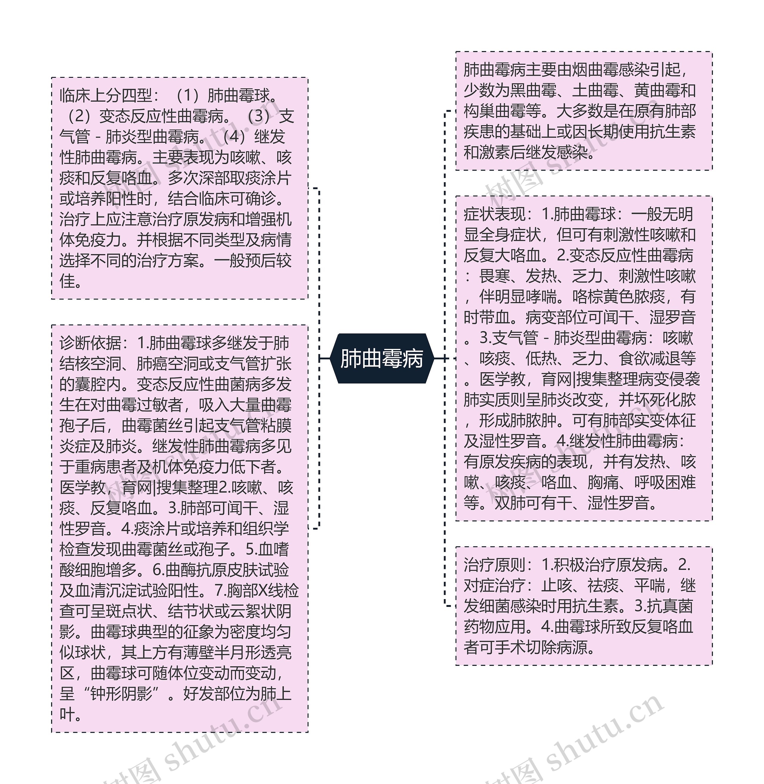 临床上分四型:(1)肺曲霉球。(2)变态反应性曲霉病。(3)支气管-肺炎型曲霉病。(4)继发性肺曲霉病。主要表现为咳嗽、咳痰和反复咯血。多次深部取痰涂片或培养阳性时,结合临床可确诊。治疗上应注意治疗原发病和增强机体免疫力。并根据不同类型及病情选择不同的治疗方案。一般预后较佳。