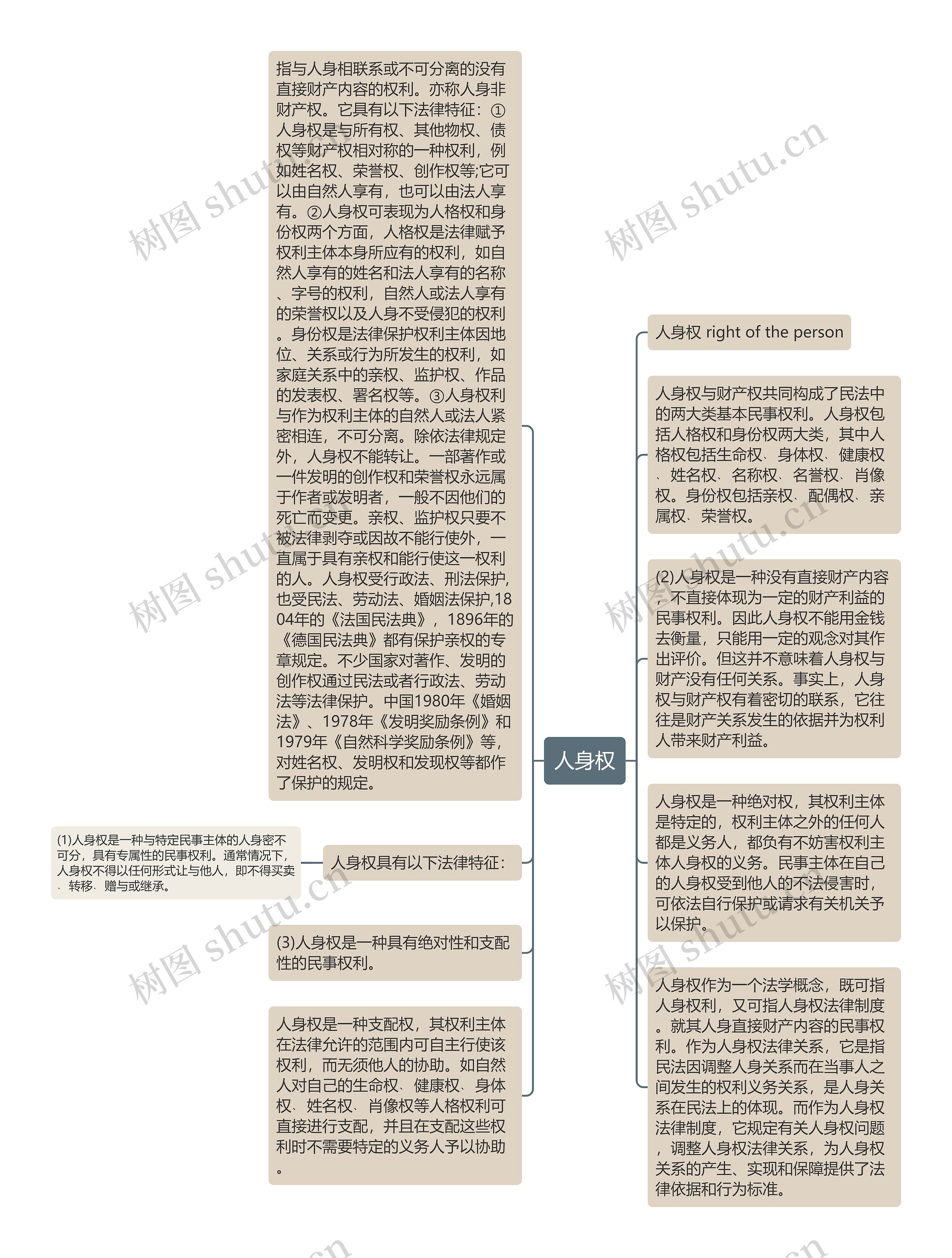 指与人身相联系或不可分离的没有直接财产内容的权利。亦称人身非财产权。它具有以下法律特征:①人身权是与所有权、其他物权、债权等财产权相对称的一种权利,例如姓名权、荣誉权、创作权等;它可以由自然人享有,也可以由法人享有。②人身权可表现为人格权和身份权两个方面,人格权是法律赋予权利主体本身所应有的权利,如自然人享有的姓名和法人享有的名称、字号的权利,自然人或法人享有的荣誉权以及人身不受侵犯的权利。身份权是法律保护权利主体因地位、关系或行为所发生的权利,如家庭关系中的亲权、监护权、作品的发表权、署名权等。③人身权利与作为权利主体的自然人或法人紧密相连,不可分离。除依法律规定外,人身权不能转让。一部著作或一件发明的创作权和荣誉权永远属于作者或发明者,一般不因他们的死亡而变更。亲权、监护权只要不被法律剥夺或因故不能行使外,一直属于具有亲权和能行使这一权利的人。人身权受行政法、刑法保护,也受民法、劳动法、婚姻法保护,1804年的《法国民法典》,1896年的《德国民法典》都有保护亲权的专章规定。不少国家对著作、发明的创作权通过民法或者行政法、劳动法等法律保护。中国1980年《婚姻法》、1978年《发明奖励条例》和1979年《自然科学奖励条例》等,对姓名权、发明权和发现权等都作了保护的规定。