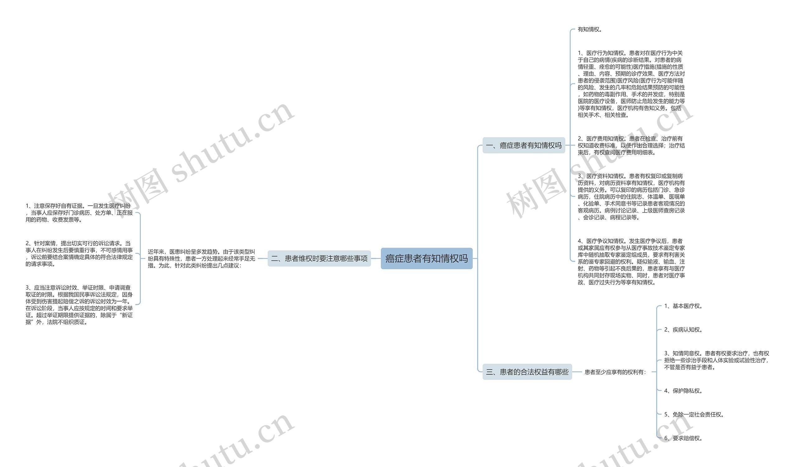 1、医疗行为知情权。患者对在医疗行为中关于自己的病情(疾病的诊断结果。对患者的病情轻重、痊愈的可能性)医疗措施(措施的性质、理由、内容、预期的诊疗效果、医疗方法对患者的侵袭范围)医疗风险(医疗行为可能伴随的风险、发生的几率和危险结果预防的可能性,如药物的毒副作用、手术的并发症,特别是医院的医疗设备,医师防止危险发生的能力等)等享有知情权,医疗机构有告知义务。包括相关手术、相关检查。
