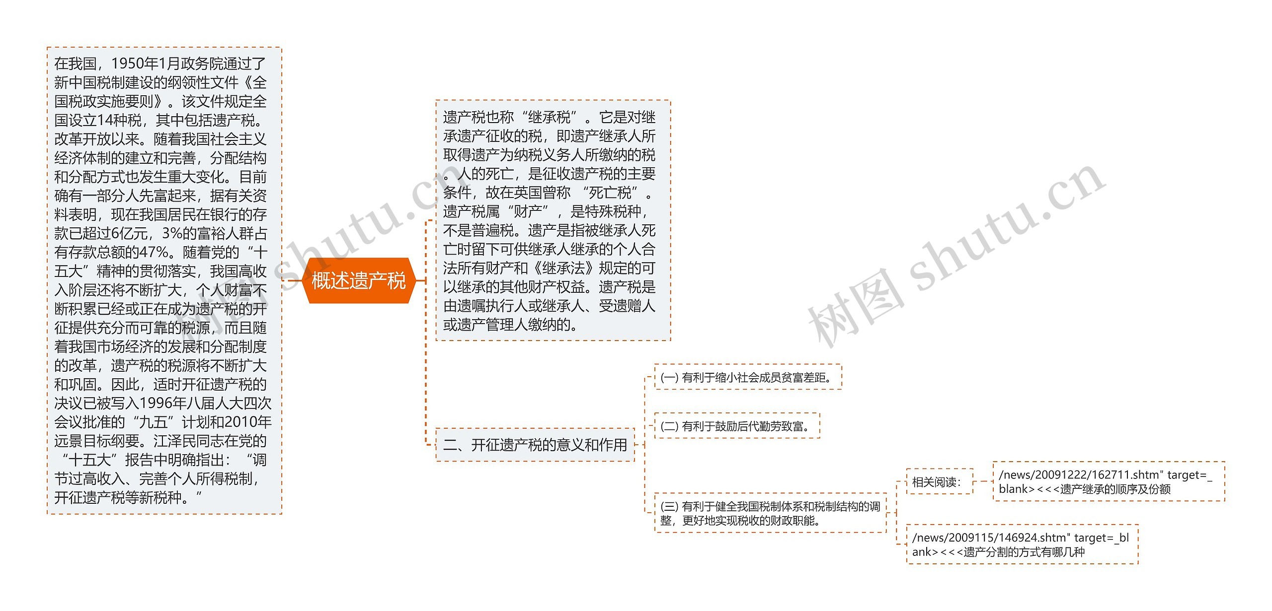 在我国,1950年1月政务院通过了新中国税制建设的纲领性文件《全国税政实施要则》。该文件规定全国设立14种税,其中包括遗产税。改革开放以来。随着我国社会主义经济体制的建立和完善,分配结构和分配方式也发生重大变化。目前确有一部分人先富起来,据有关资料表明,现在我国居民在银行的存款已超过6亿元,3%的富裕人群占有存款总额的47%。随着党的“十五大”精神的贯彻落实,我国高收入阶层还将不断扩大,个人财富不断积累已经或正在成为遗产税的开征提供充分而可靠的税源,而且随着我国市场经济的发展和分配制度的改革,遗产税的税源将不断扩大和巩固。因此,适时开征遗产税的决议已被写入1996年八届人大四次会议批准的“九五”计划和2010年远景目标纲要。江泽民同志在党的“十五大”报告中明确指出:“调节过高收入、完善个人所得税制,开征遗产税等新税种。”