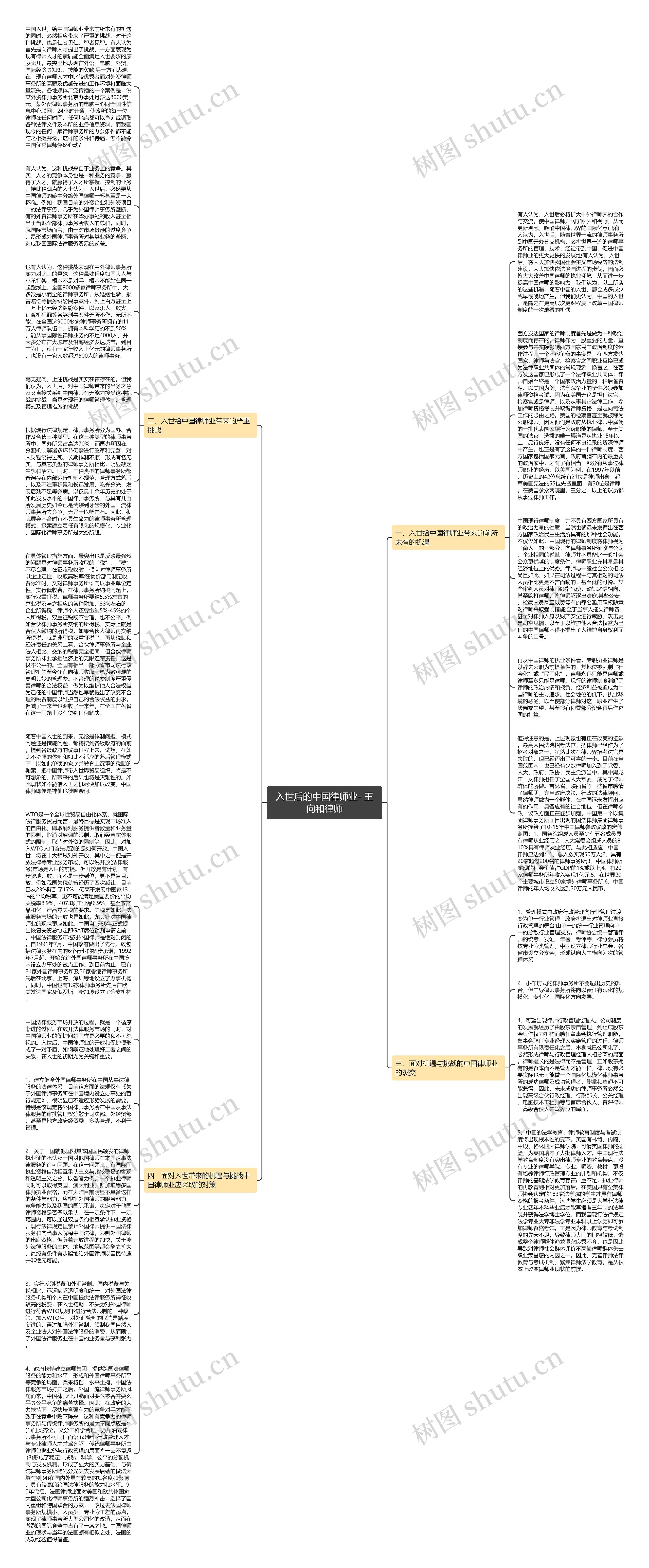 中国入世,给中国律师业带来前所未有的机遇的同时,必然相应带来了严重的挑战。对于这种挑战,也是仁者见仁,智者见智。有人认为首先是向律师人才提出了挑战,一方面表现为现有律师人才的素质能全面满足入世要求的廖廖无几,最突出地表现在外语、电脑、外贸、国际经济等知识、技能的欠缺;另一方面表现在,现有律师人才中比较优秀者面对外资律师事务所的高薪及优越先进的工作环境将面临大量流失。各地媒体广泛传播的一个案例是,说某外资律师事务所北京办事处月薪达8000美元,某外资律师事务所的电脑中心同全国性信息中心联网,24小时开通,使该所的每一位律师在任何时间、任何地点都可以查询或调取各种法律文件及本所的业务信息资料。而我国现今的任何一家律师事务所的办公条件都不能与之相提并论,这样的条件和待遇,怎不能令中国优秀律师怦然心动?